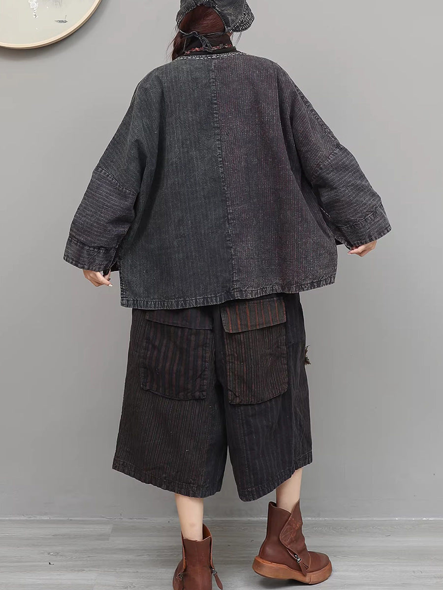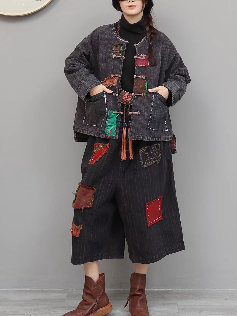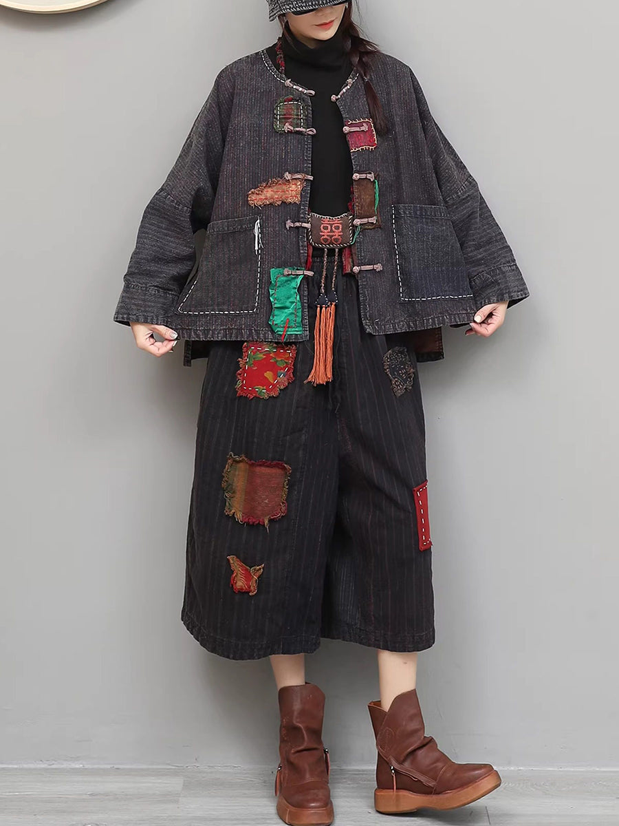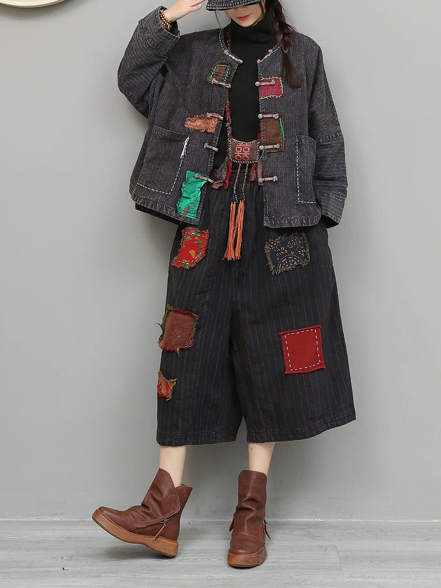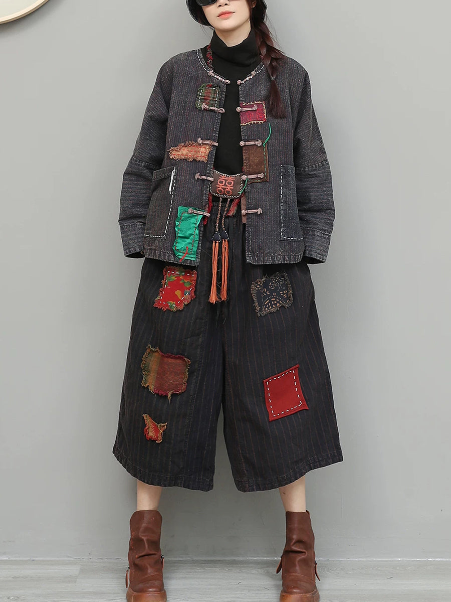 Women Spring Ethnic Patch Spliced O-Neck Suits