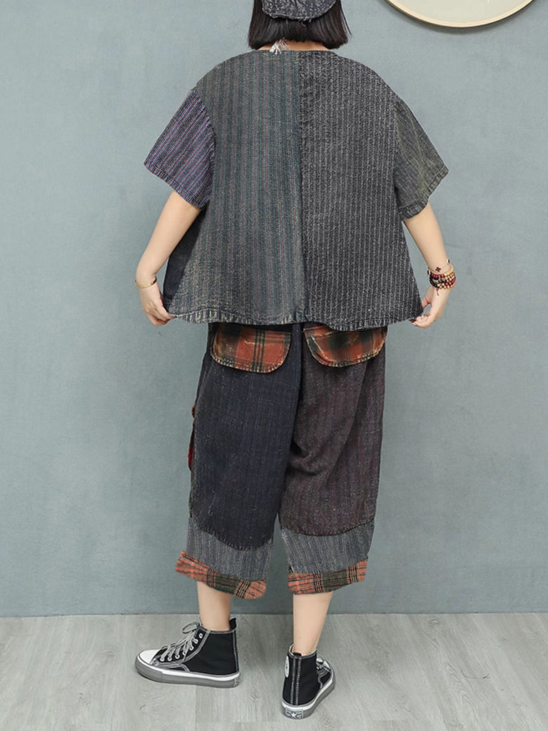 Plus Size Women Summer Vintage Patchwork Loose Suits