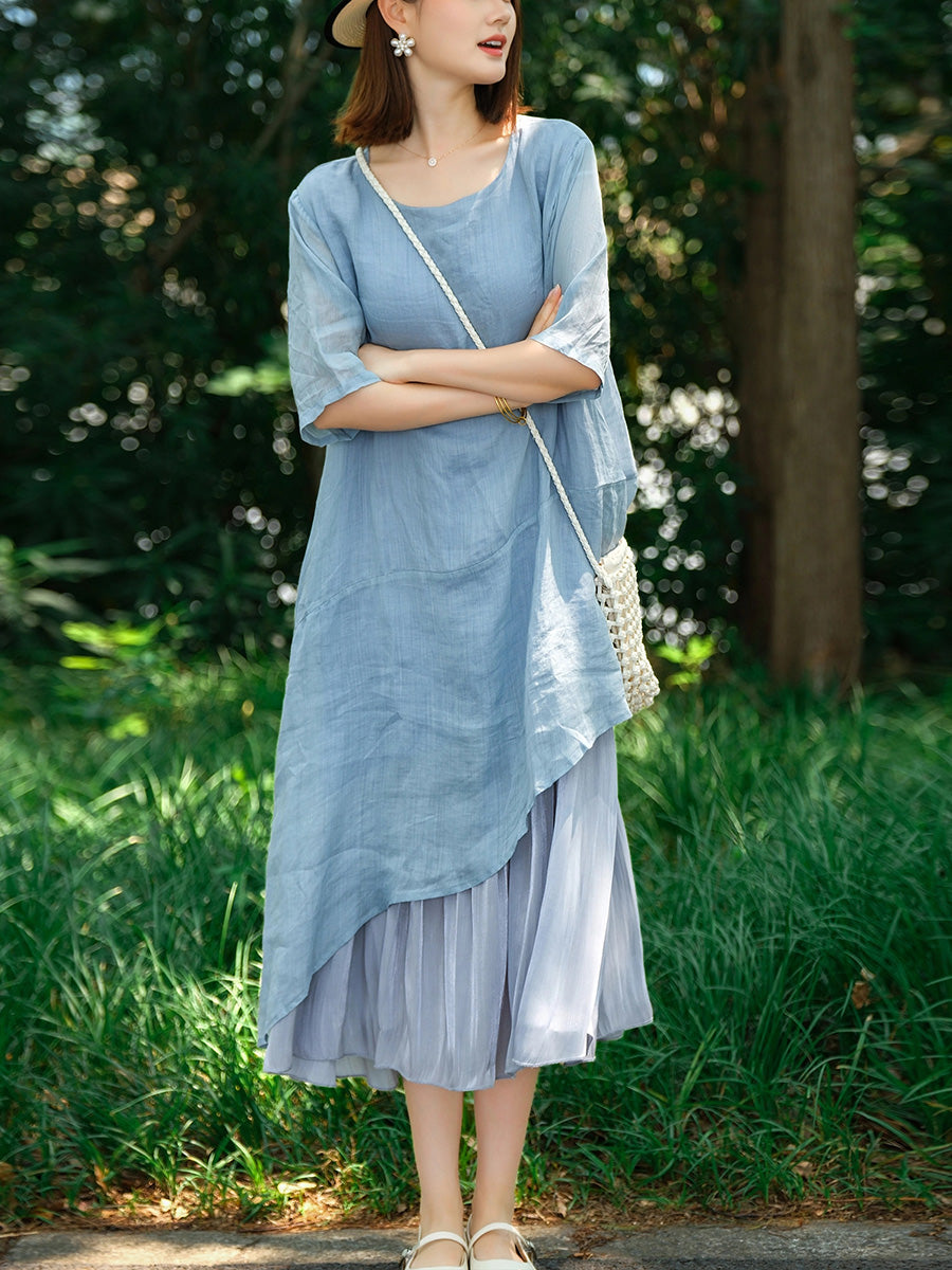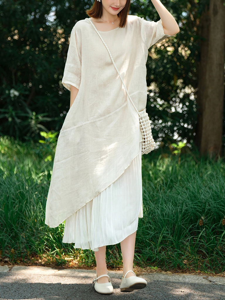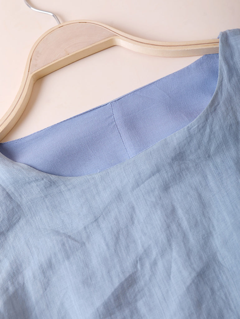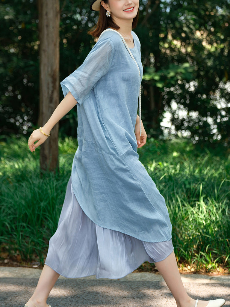 Vestido de verano para mujer, de ramio 100 %, con cuello redondo y estampado de colores puros