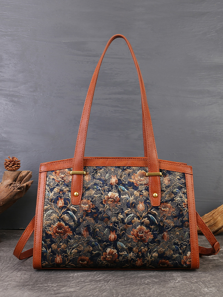 Bolso vintage de mezclilla con estampado floral y detalles de cuero.