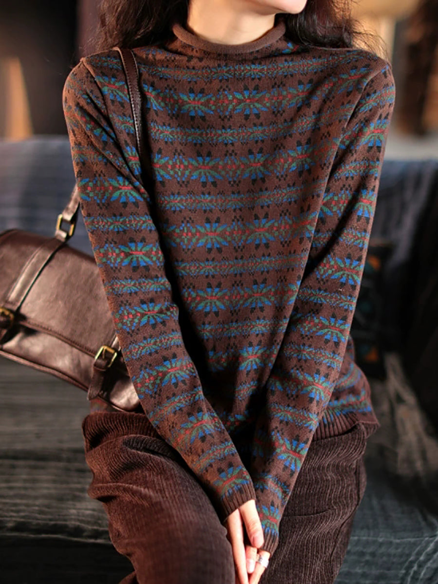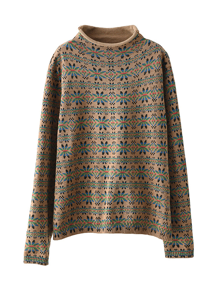 Suéter cálido de cuello alto con estampado floral vintage para mujer de talla grande