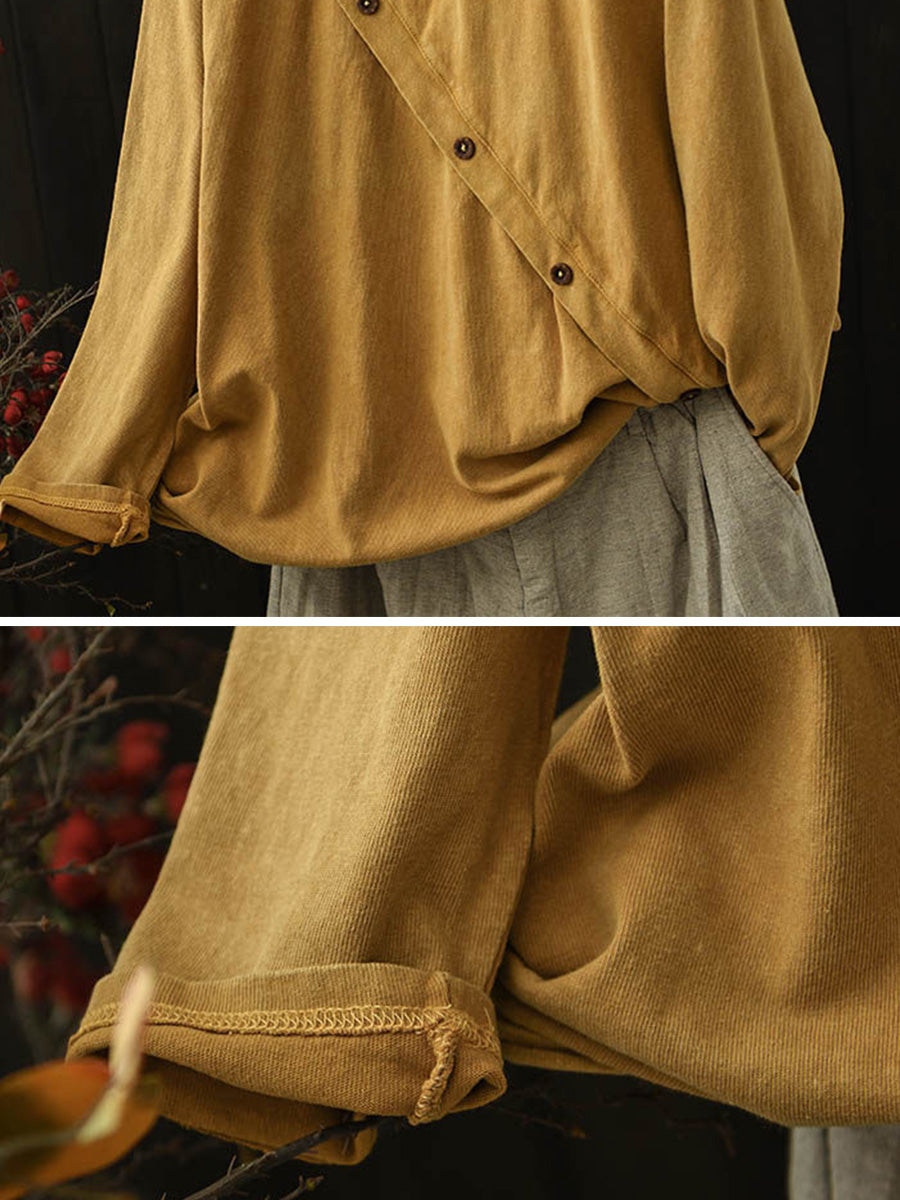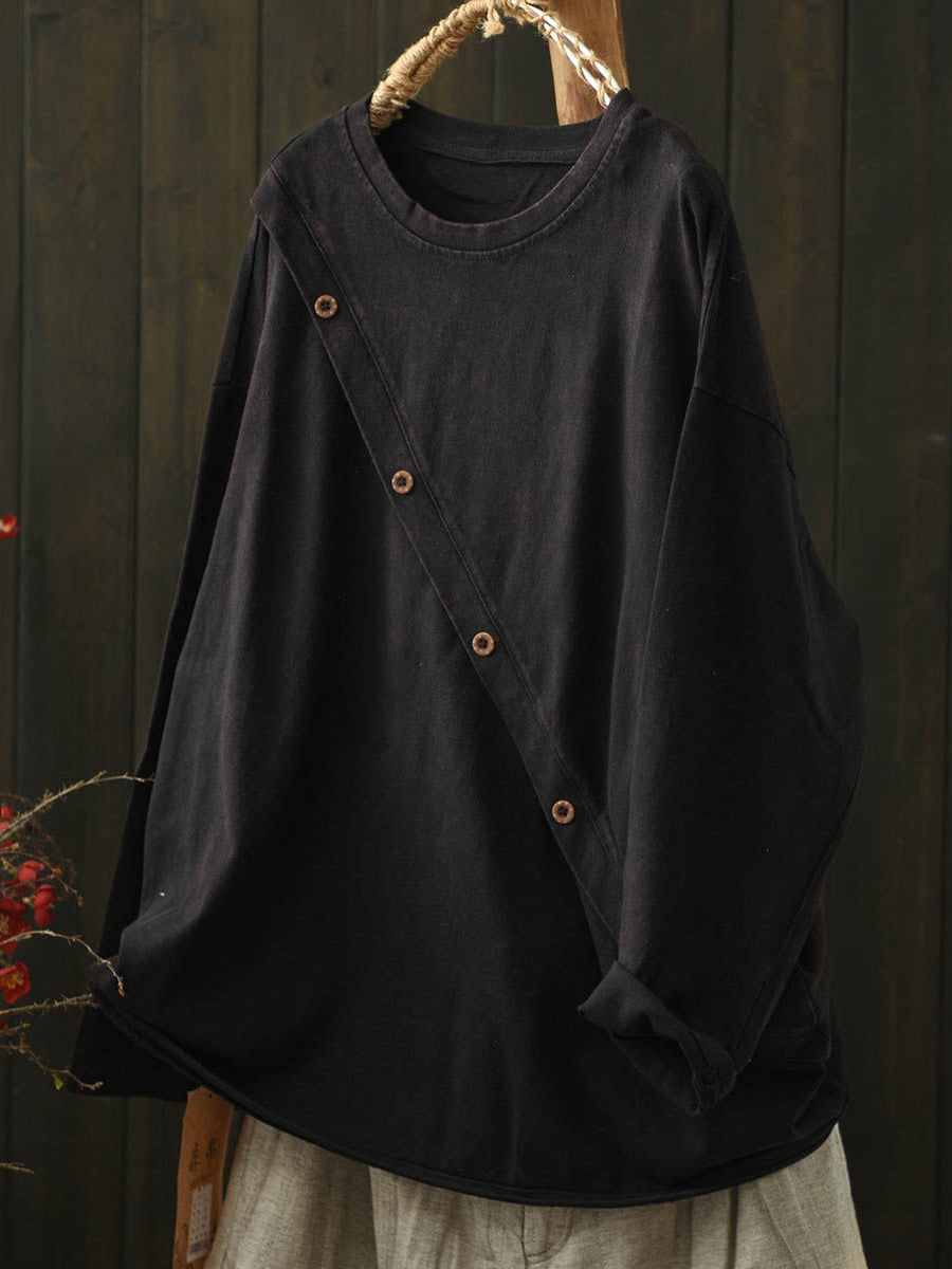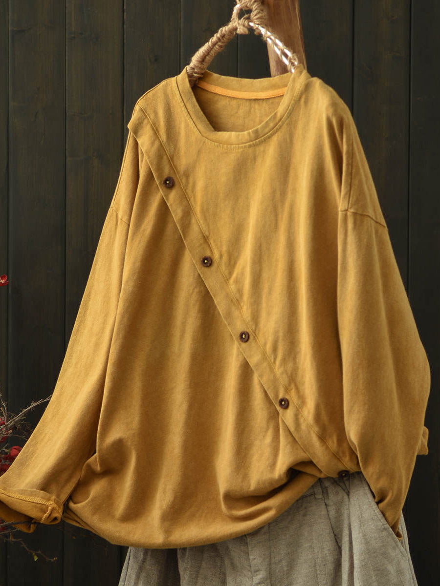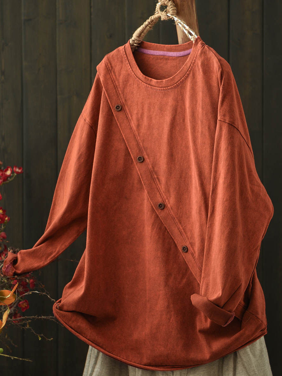 Chemisier en coton à col rond et boutons asymétriques pour femme, style automne artistique