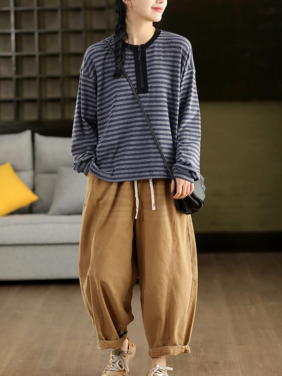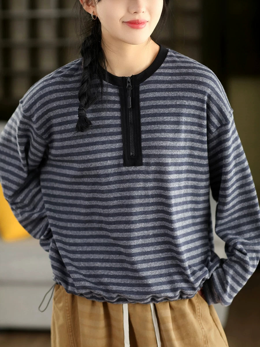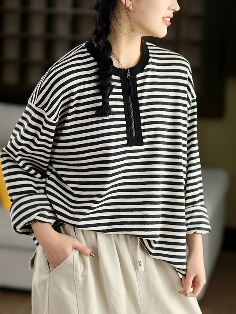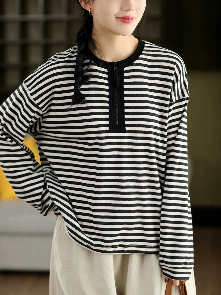 Chemisier en coton à rayures printanières pour femme, col rond, style artistique