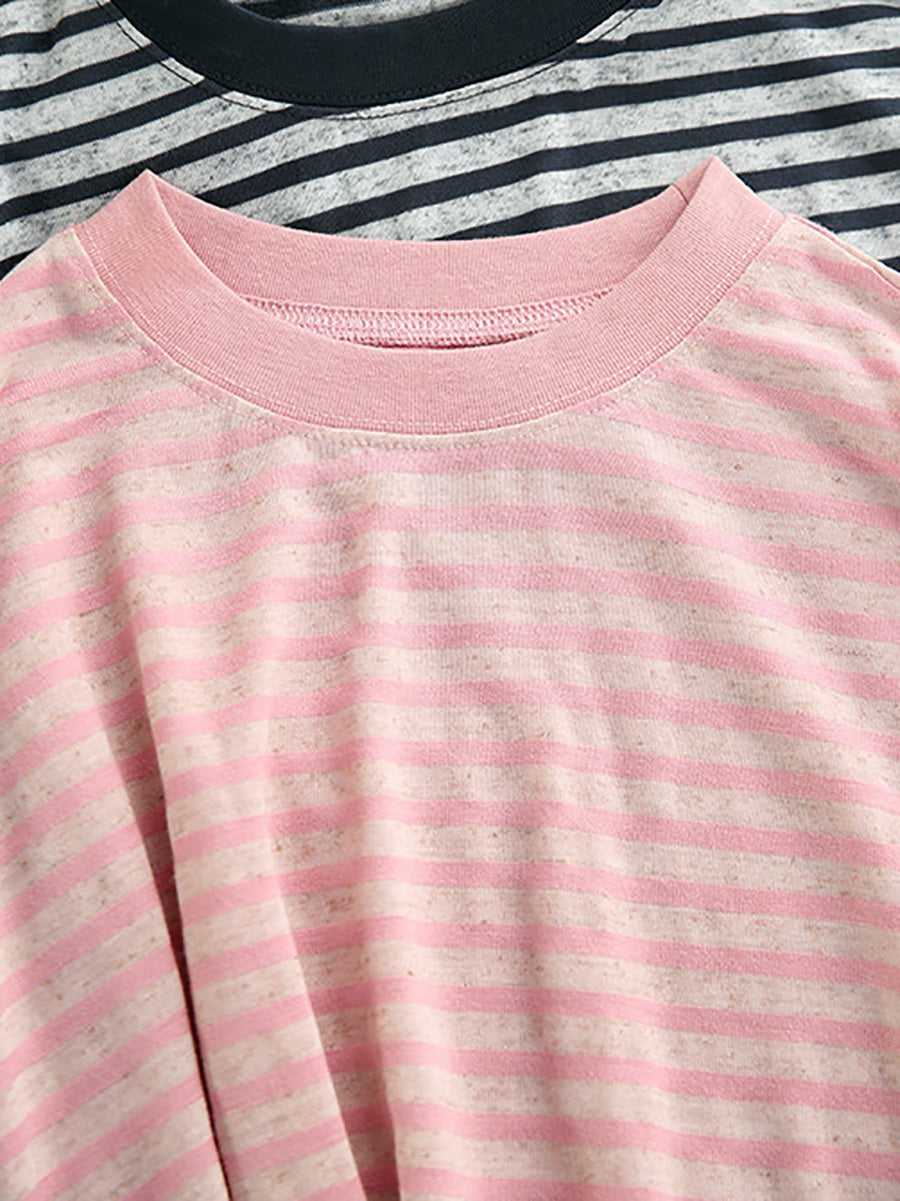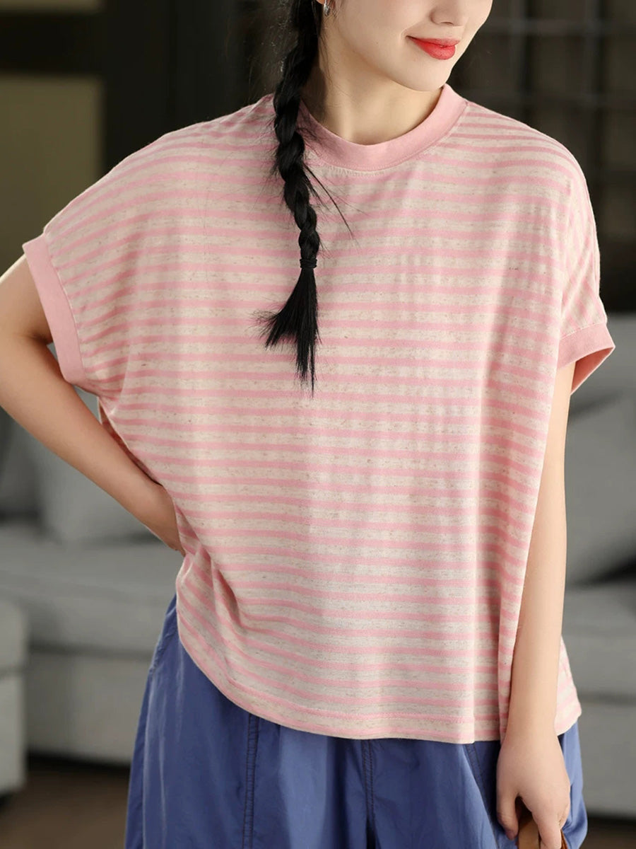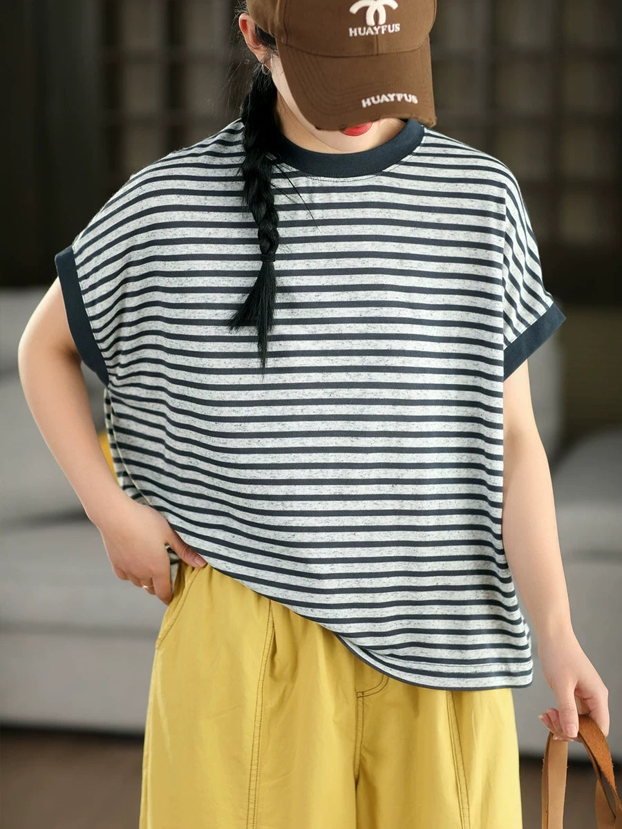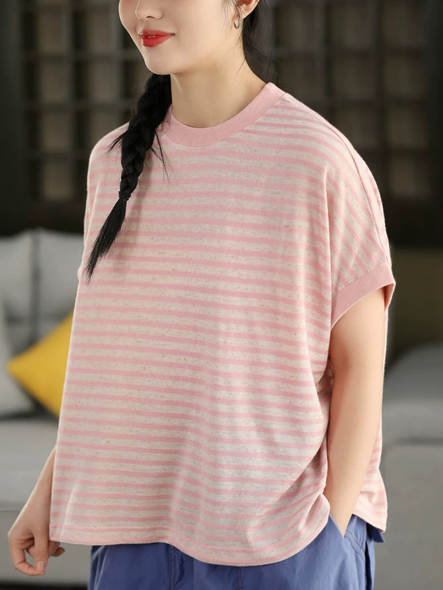 Chemise d'été décontractée à rayures et col rond pour femme