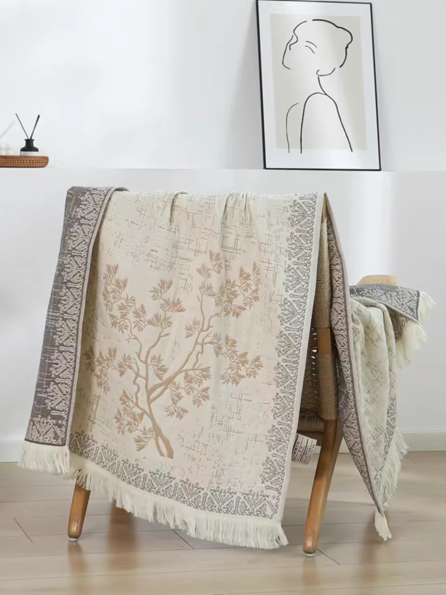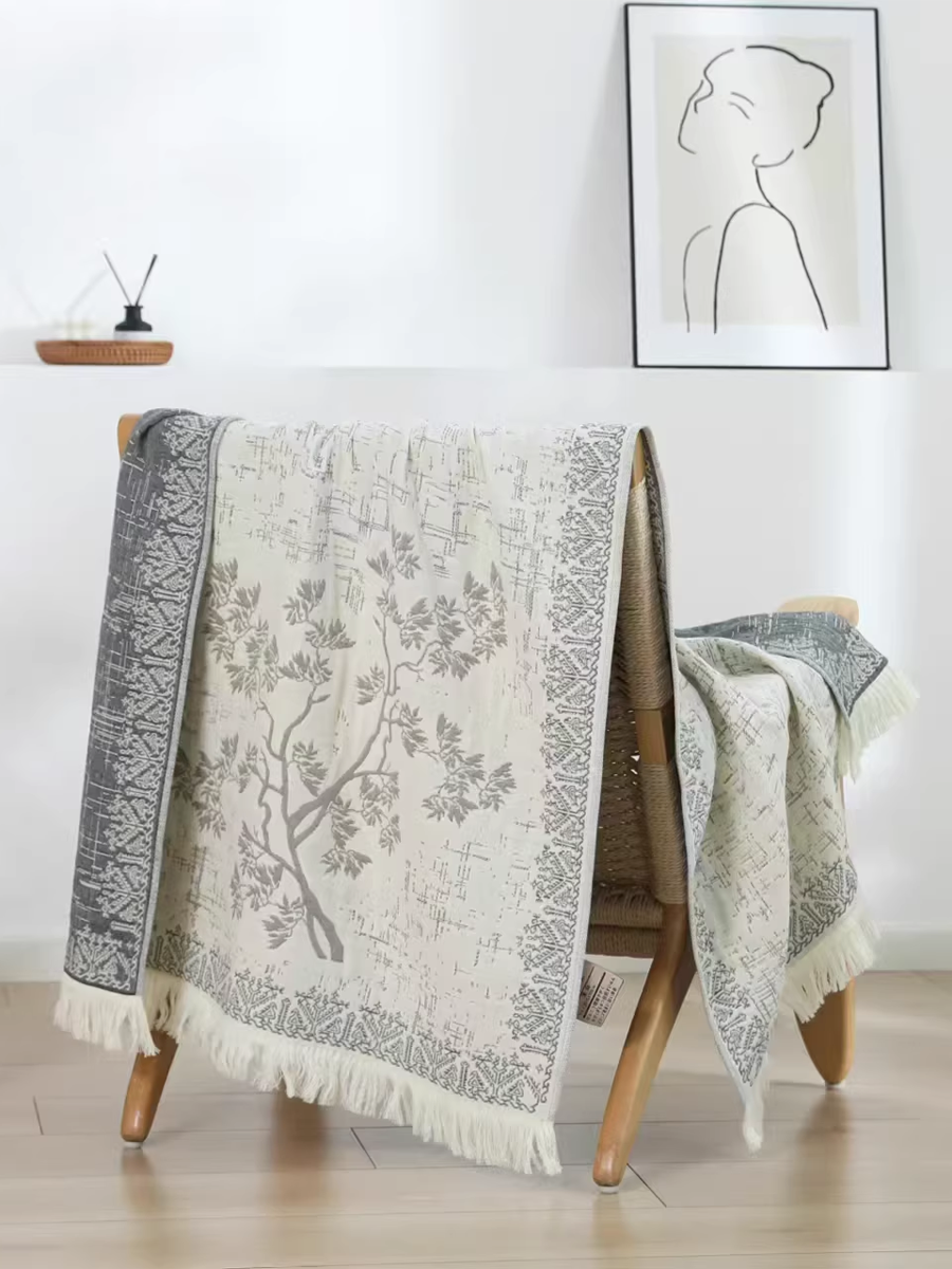 Serviette de bain en lin à pompons et jacquard à motif floral