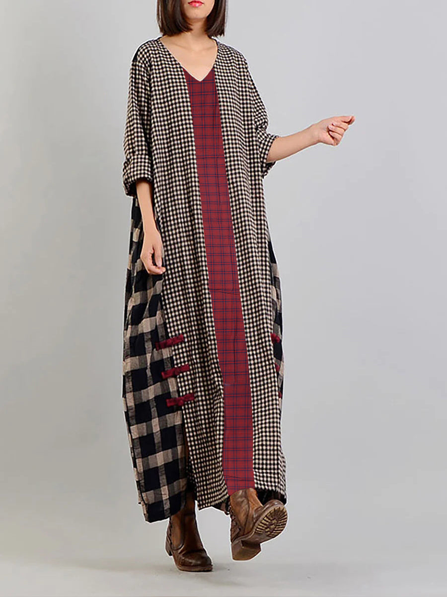 שמלת פשתן רטרו כותנה משובצת בצבעים שונים
