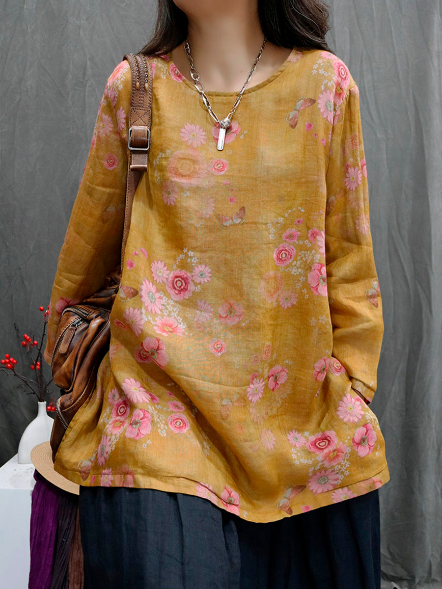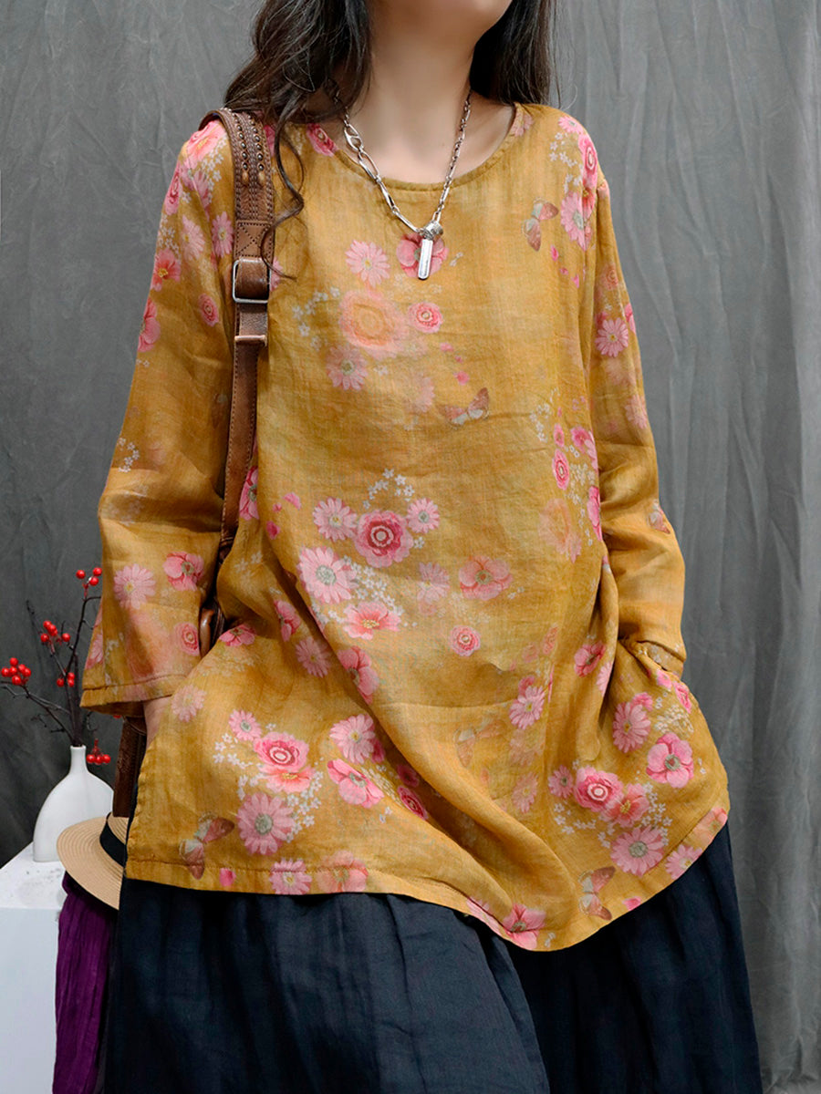 חולצת חורף אומנותית עם צווארון O פרחוני 100% רמי לנשים