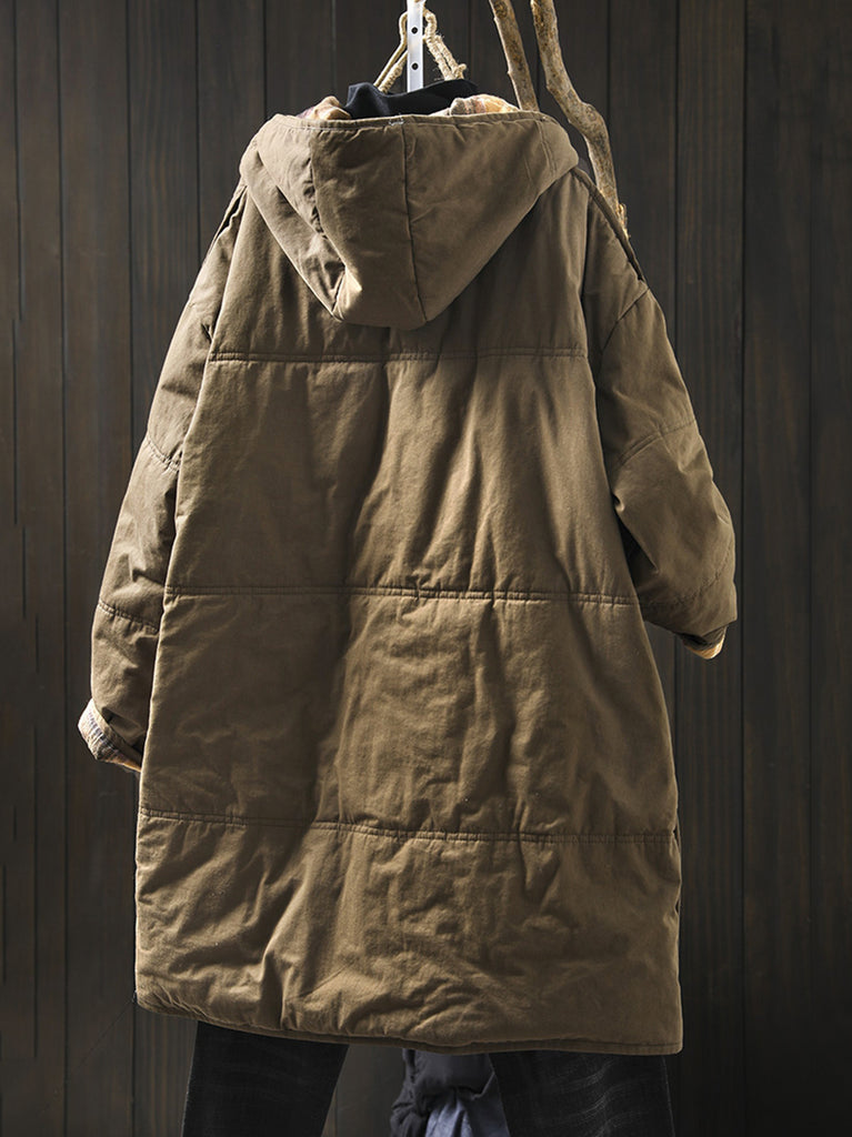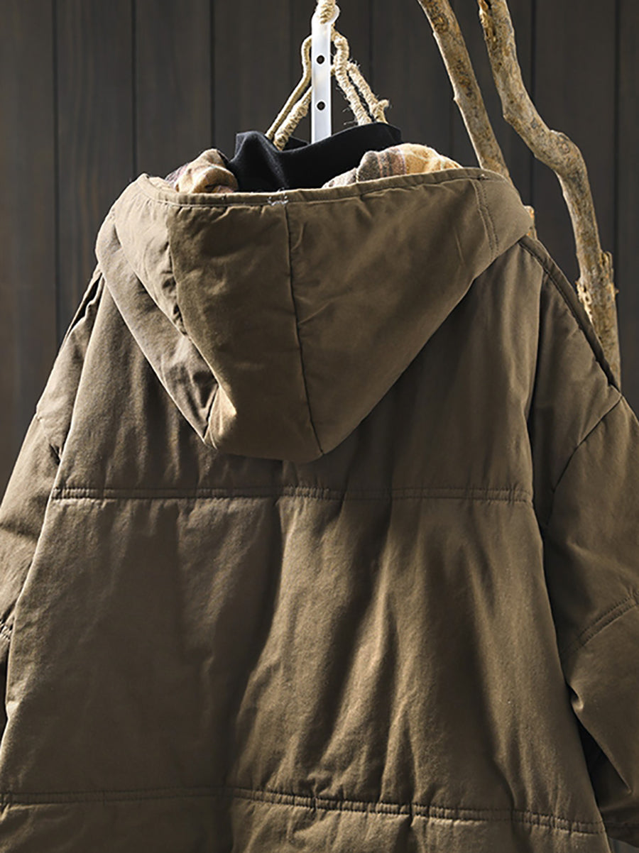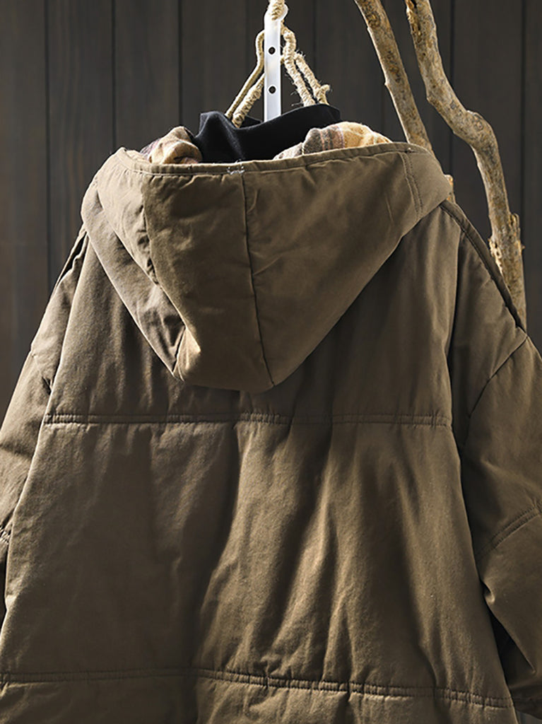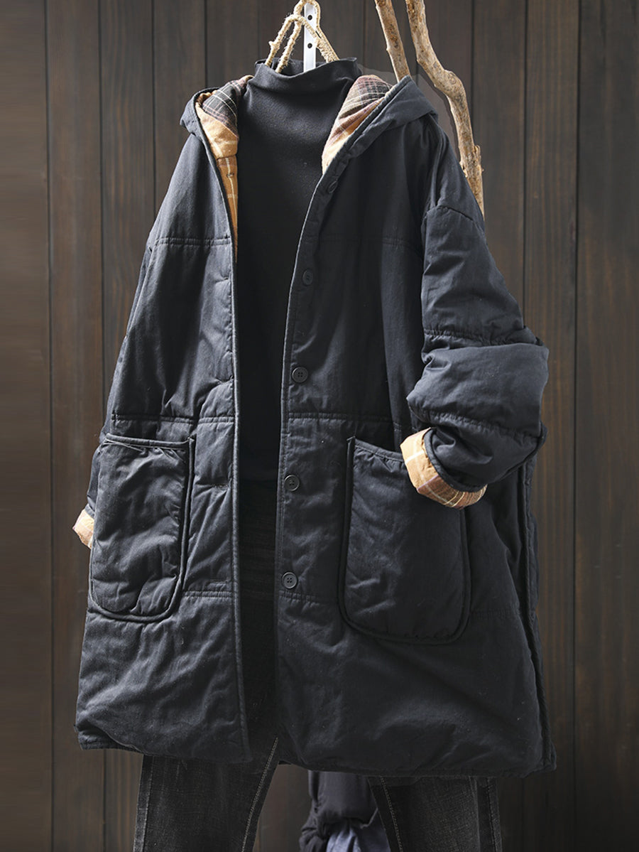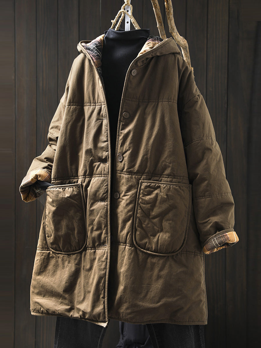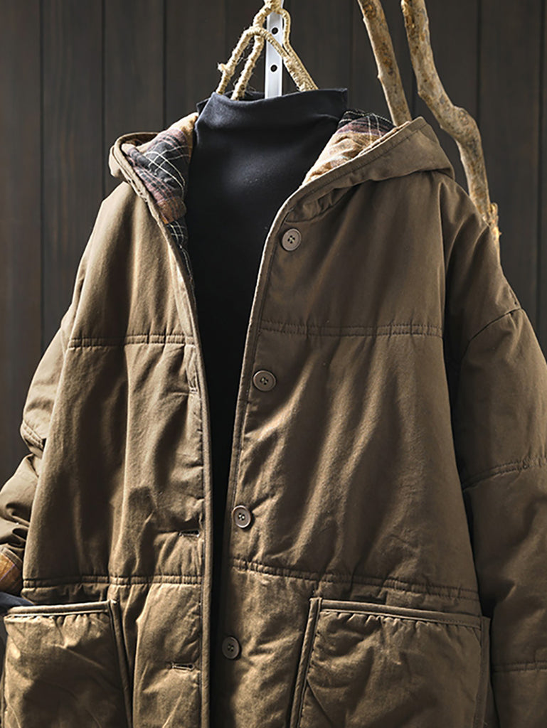 Ovaj kaput dizajniran je s kariranim uzorkom i O-izrezom, a izrađen je od pamučnog materijala. Puni raglan rukavi daju mu retro izgled, što ga čini savršenim za zimske i jesenske sezone.