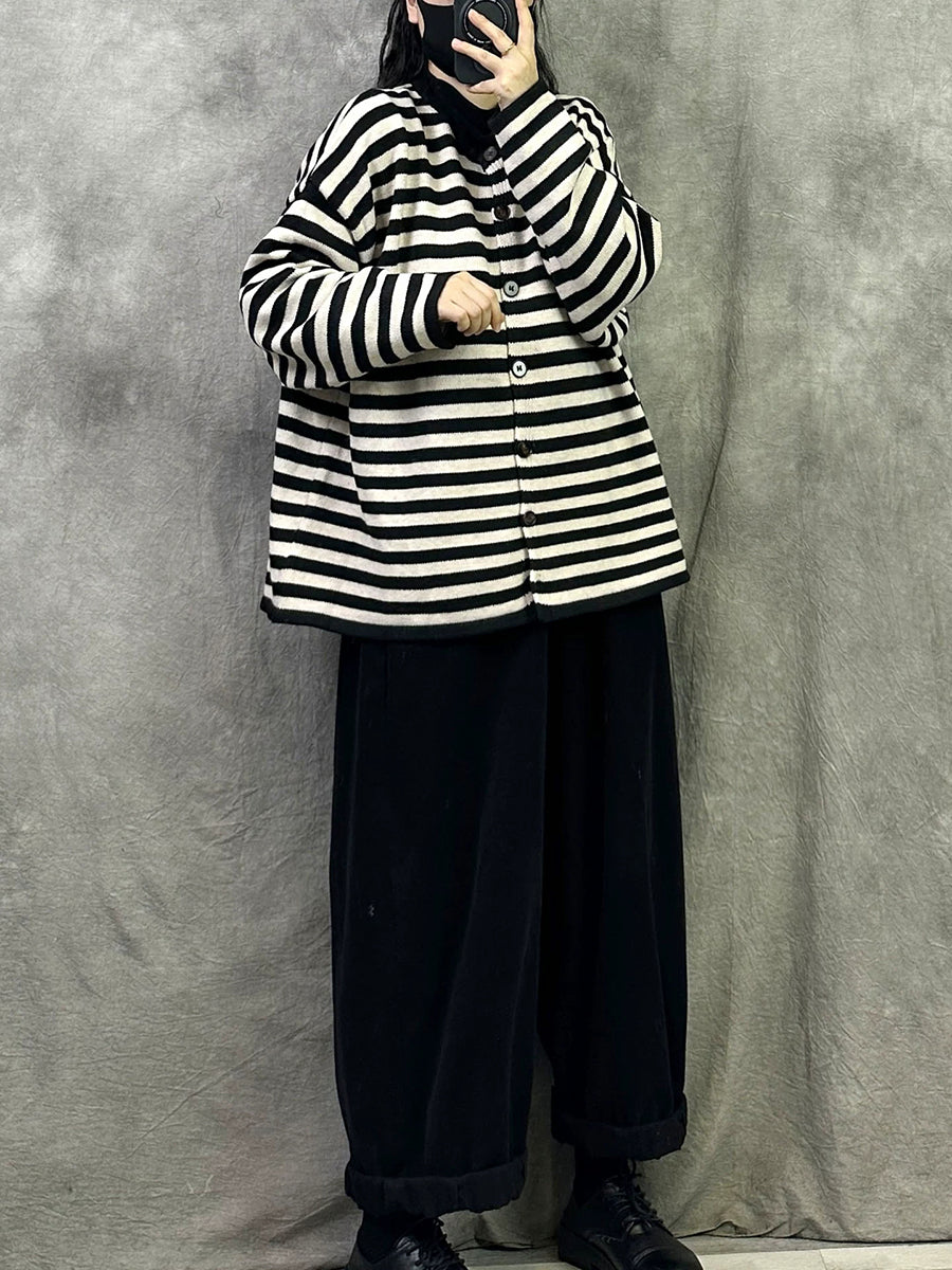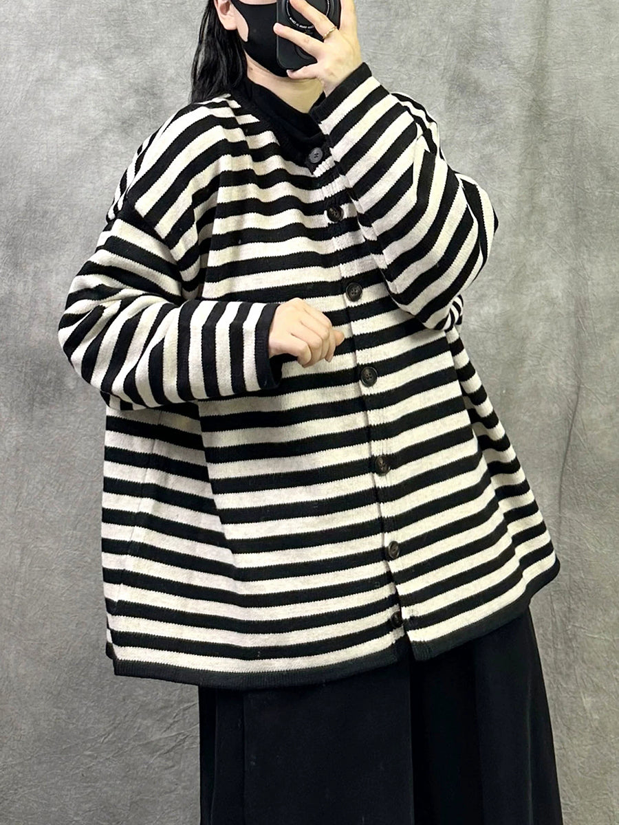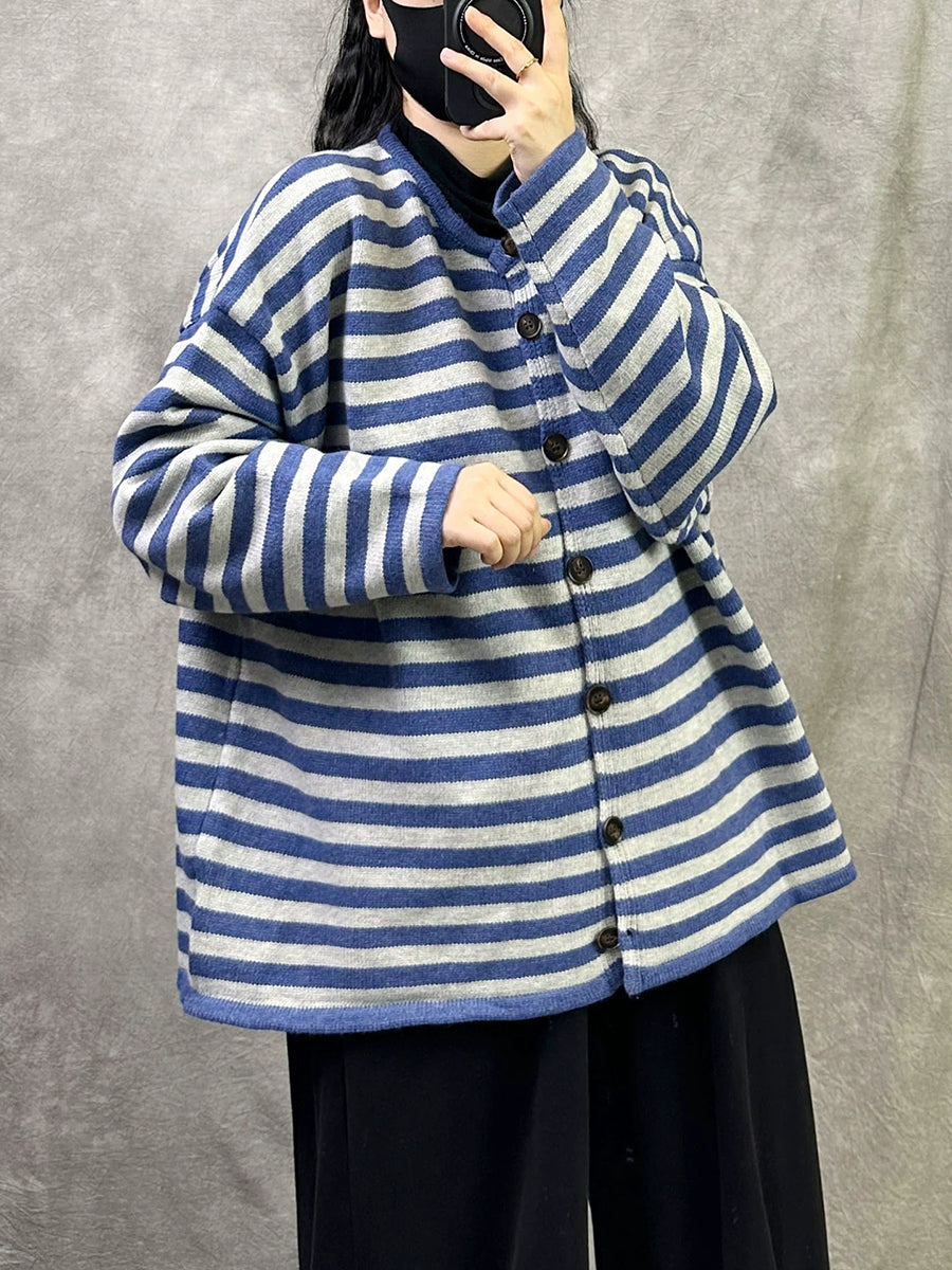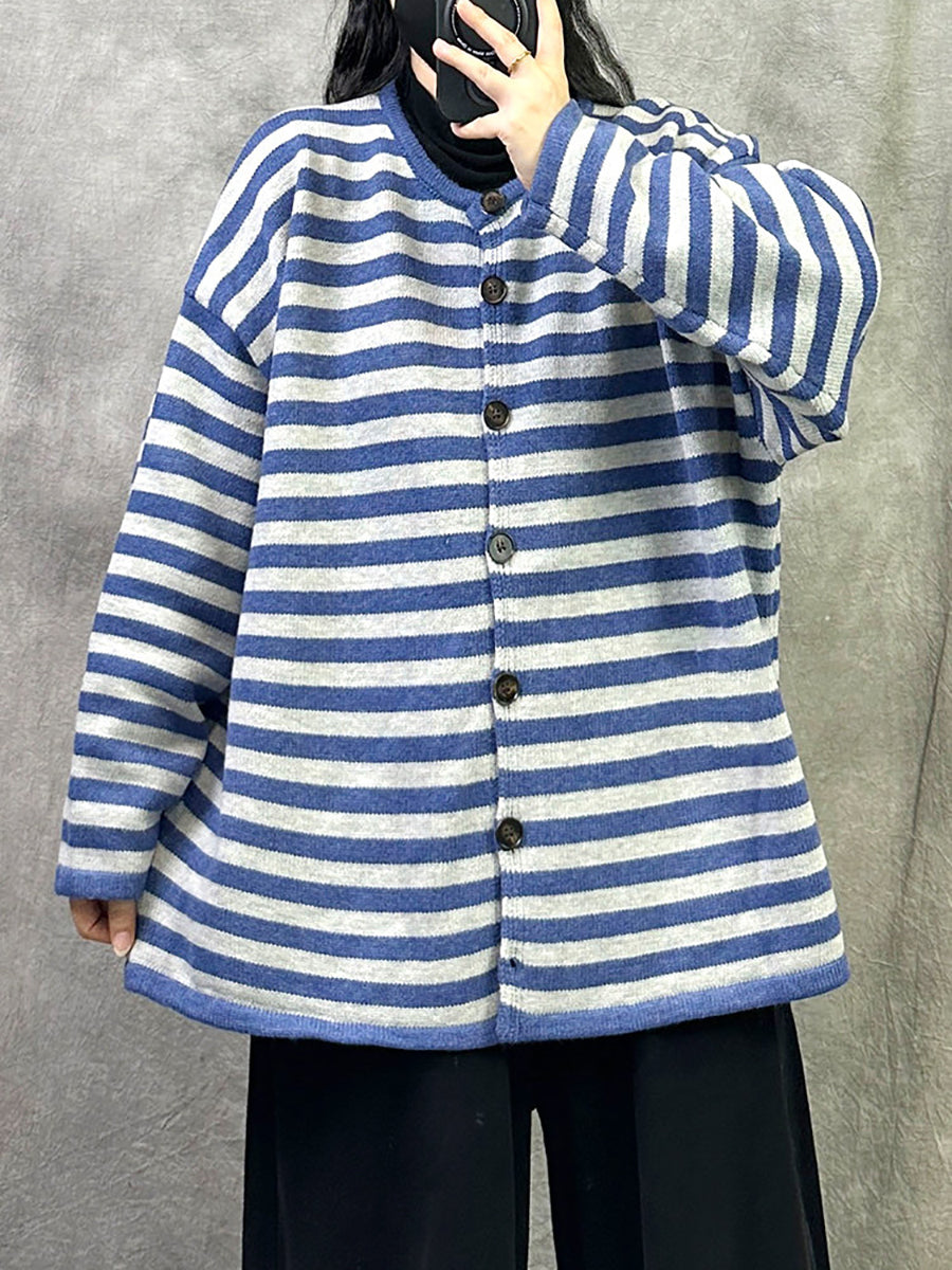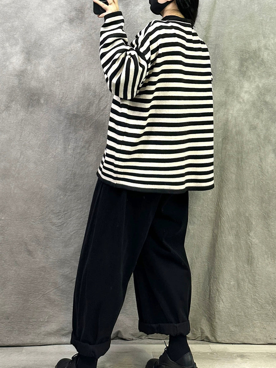 Női művészi tavaszi csíkos O-nyakú pamutkabát