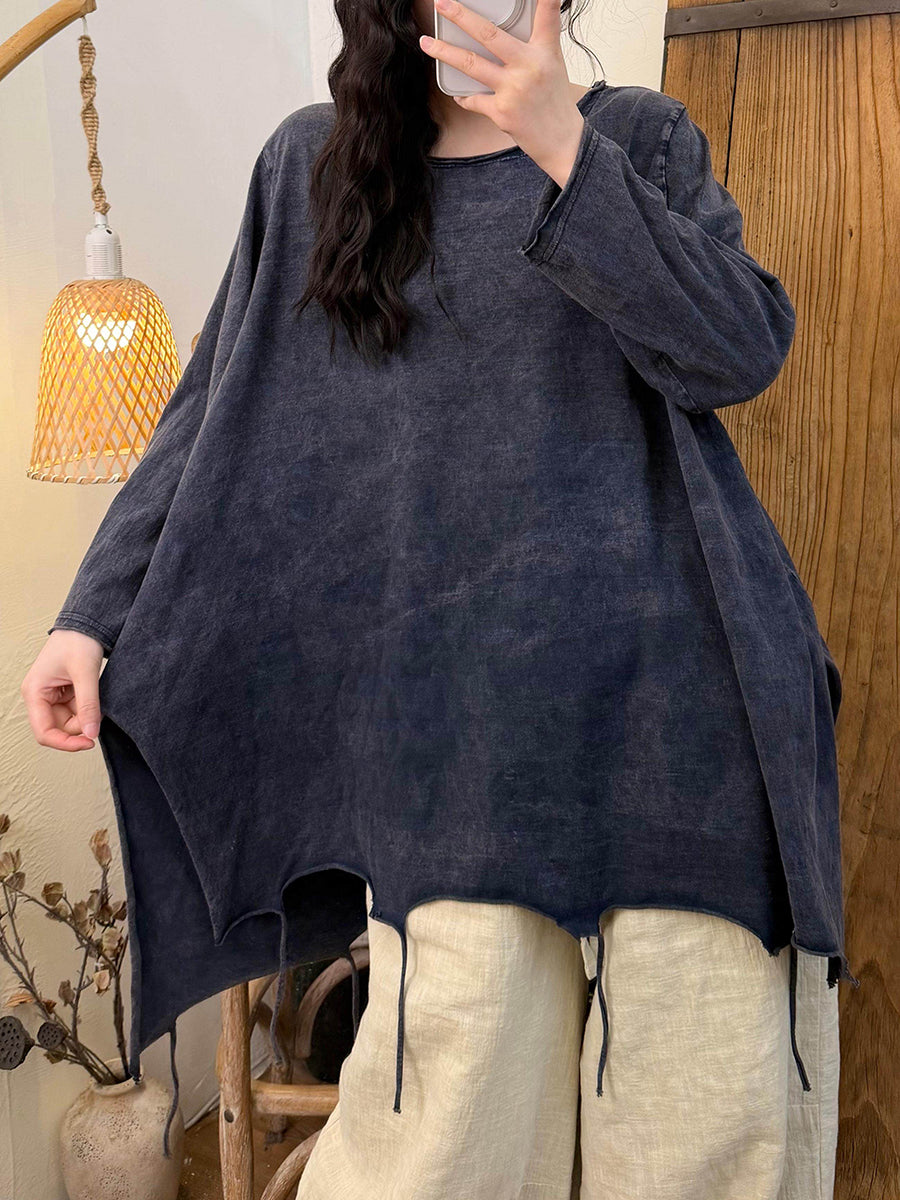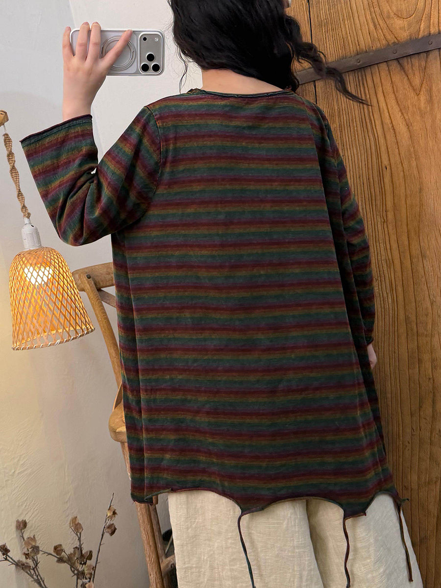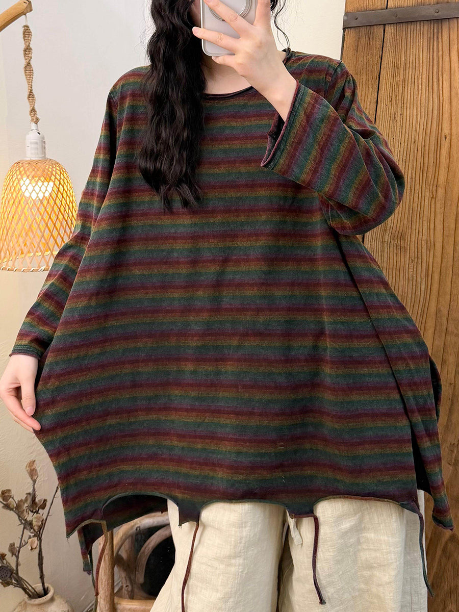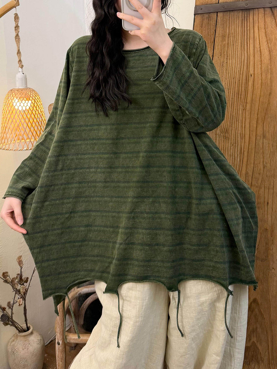 Női tavaszi retró csíkos pamut bojtos szegélyű O-nyakú blúz