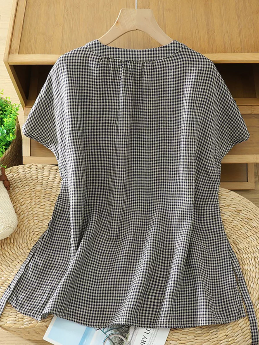 Női nyári retró kockás V-nyakú blúz