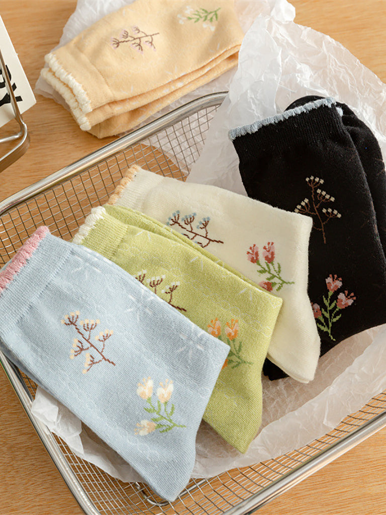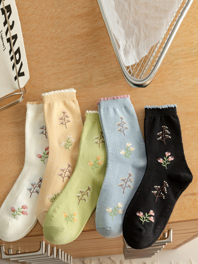 5 pör af hreinni bómull, blómasokkum fyrir konur