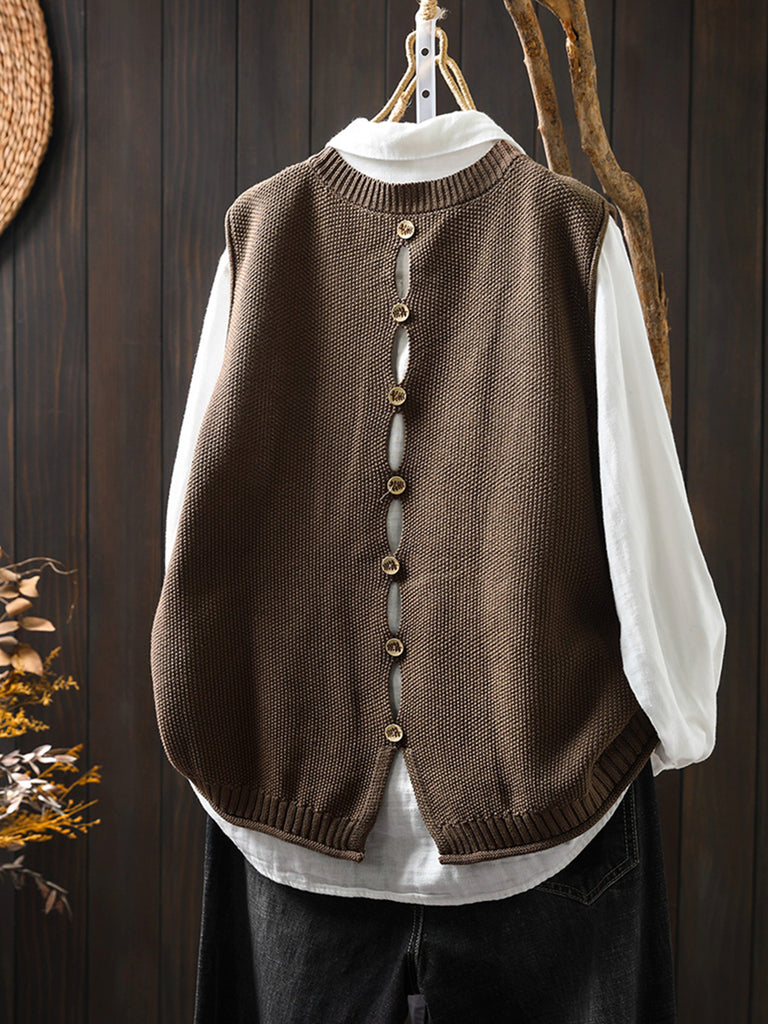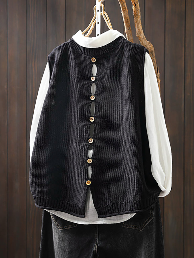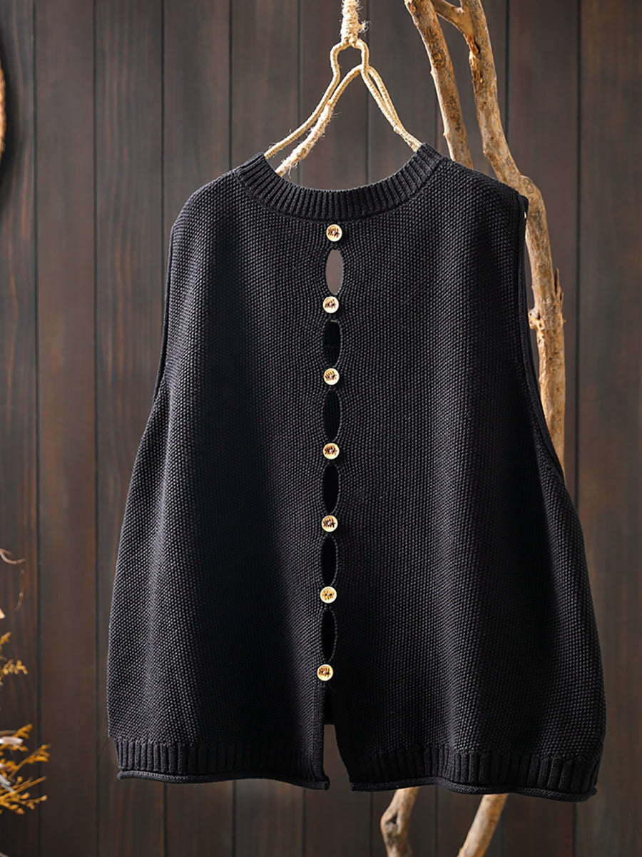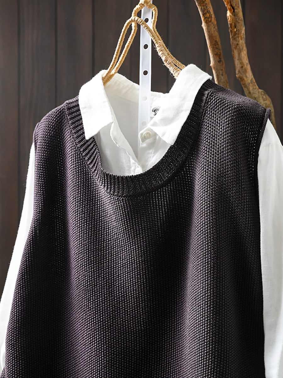 Þetta vesti státar af traustu mynstri og klassískri O-háls hönnun. Með ermalausum stíl og retro tilfinningu er þetta fjölhæfa stykki fullkomið fyrir kaldari árstíðir hausts og vetrar.