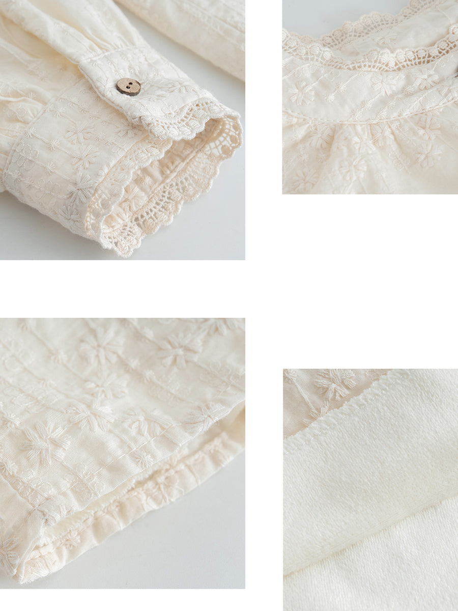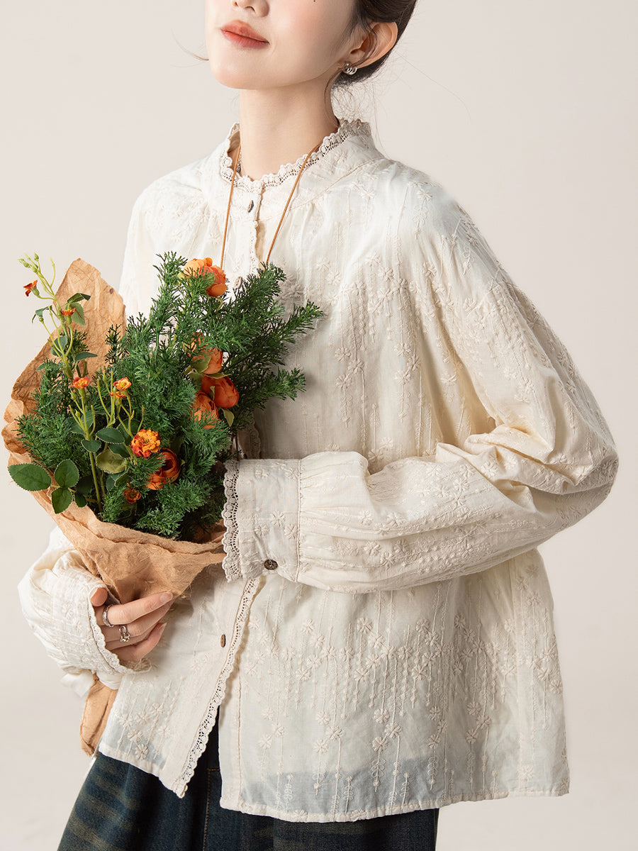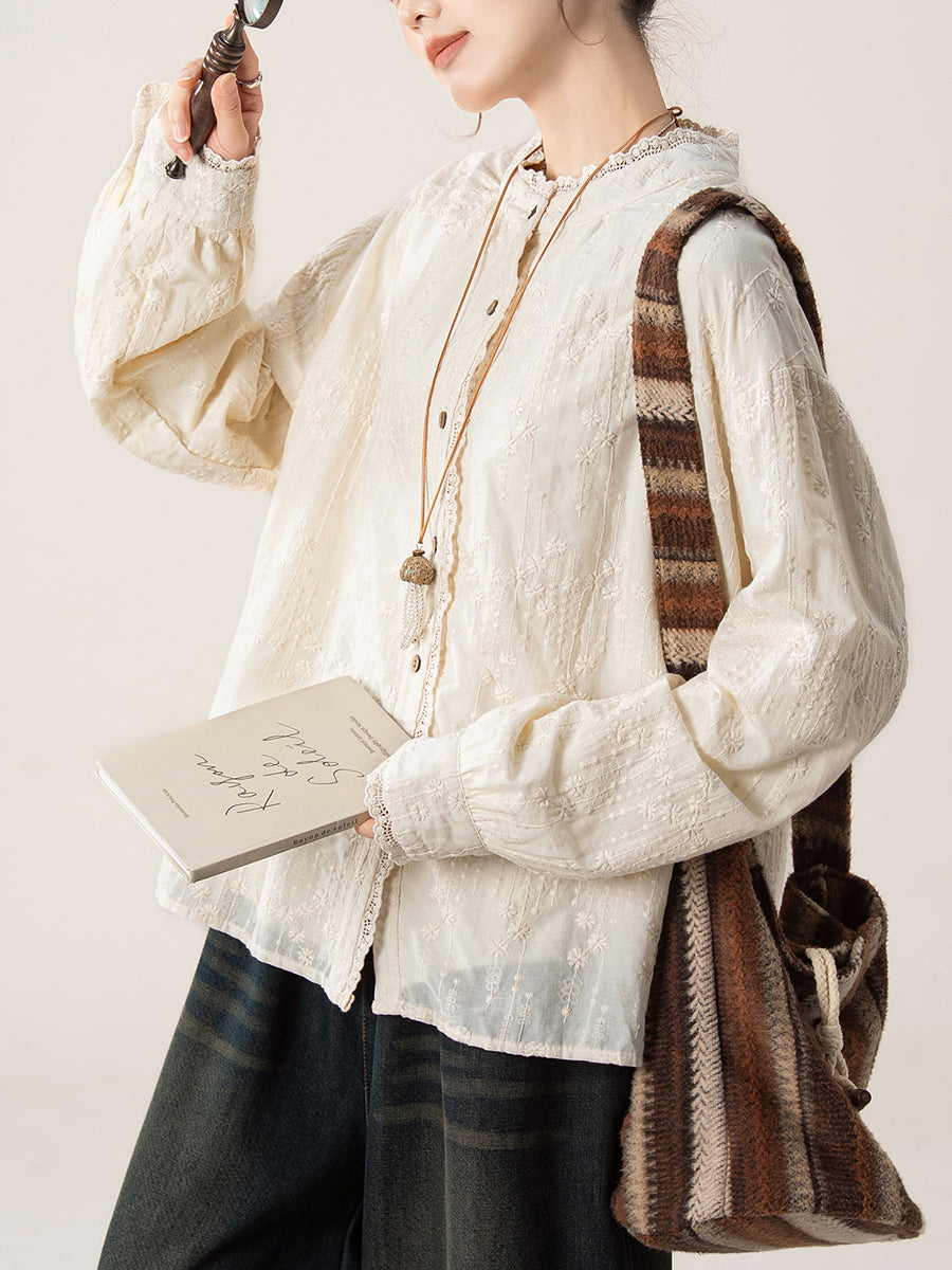 Listræn haustskyrta með útsaumi úr blúndukraga fyrir konur