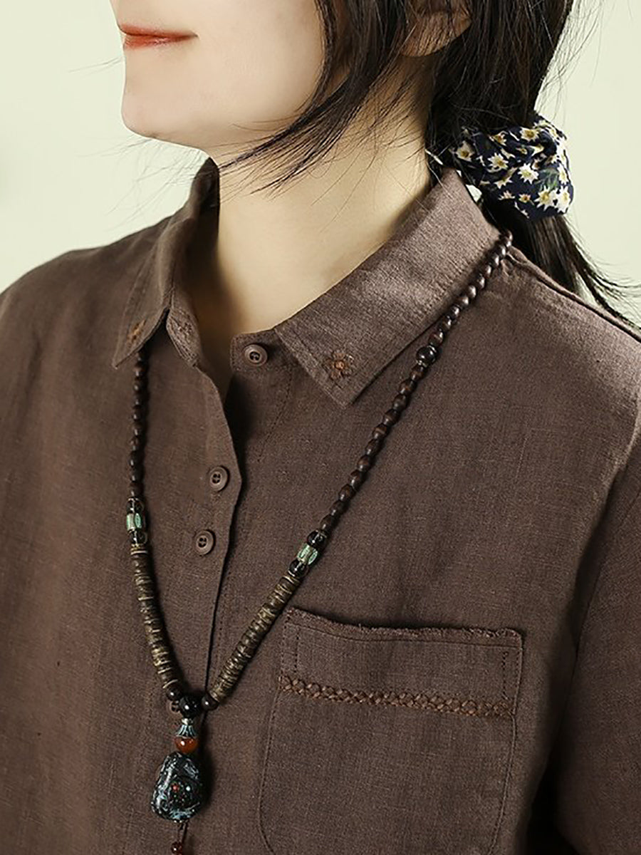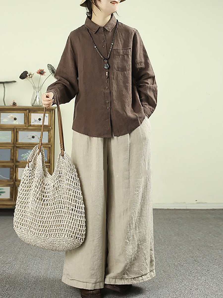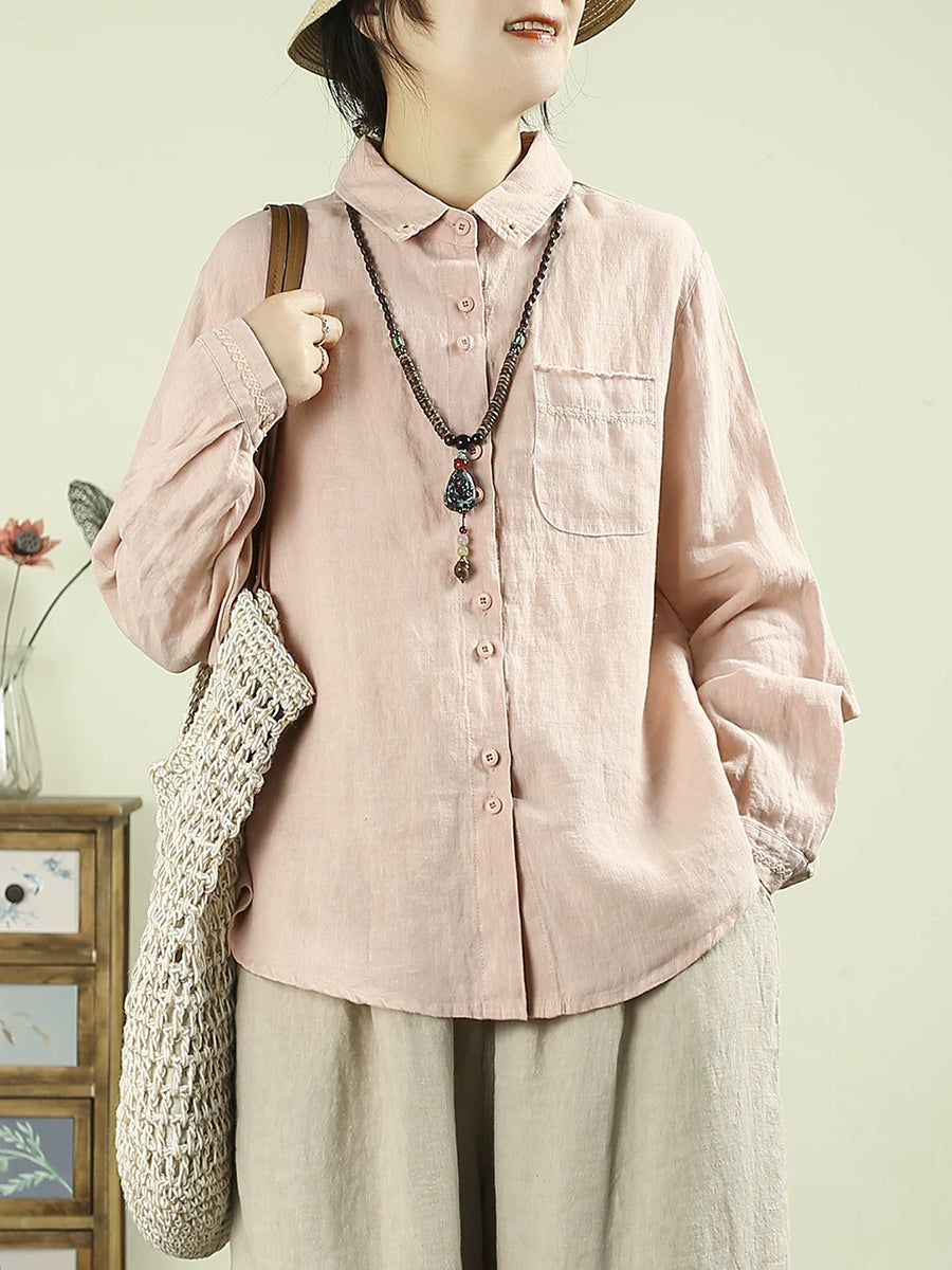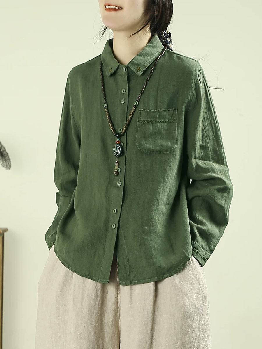 Listræn vorskyrta fyrir konur, hreinlituð úr 100% hör með niðurfellanlegum kraga