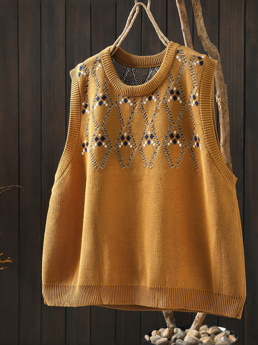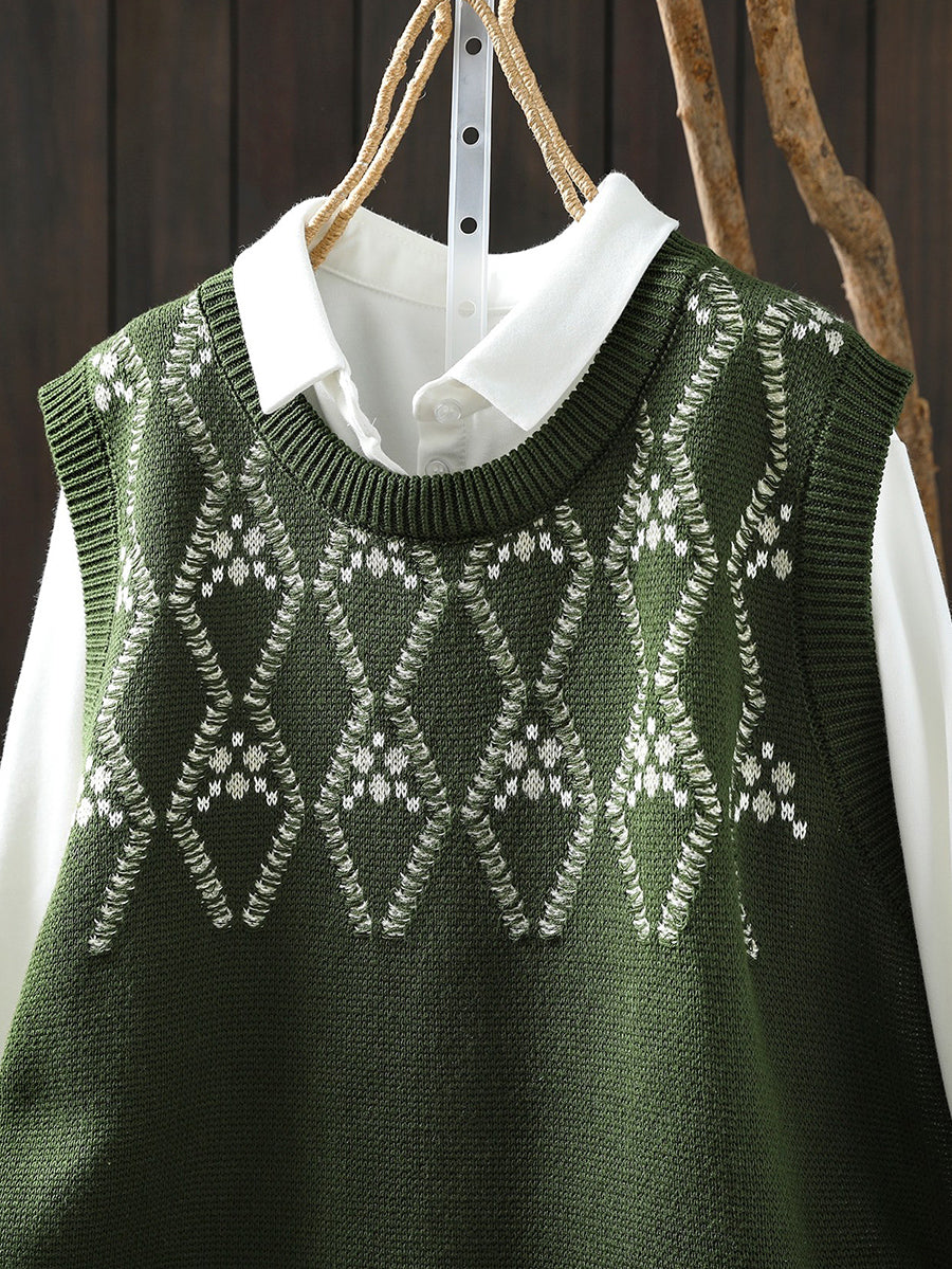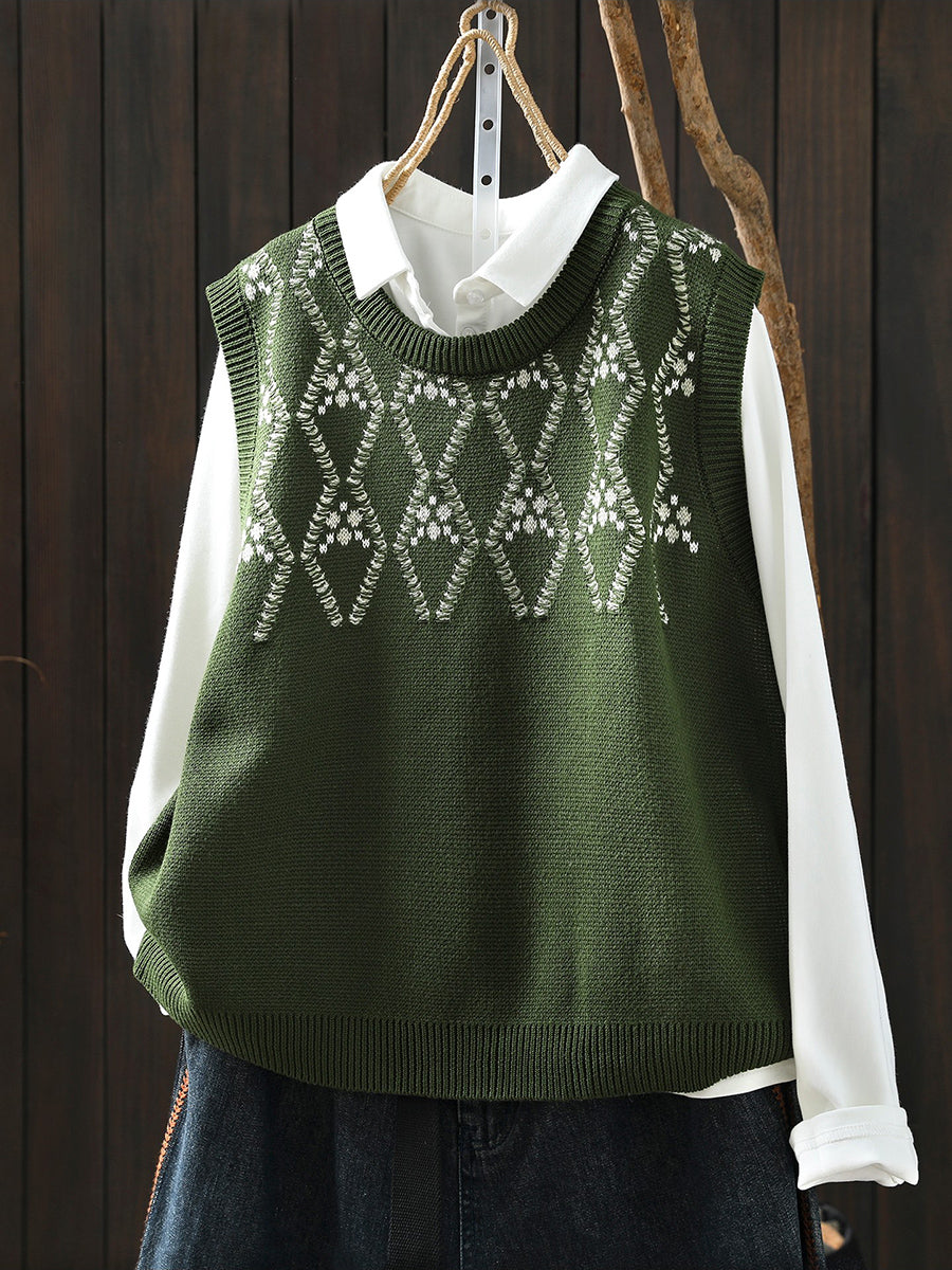Prjónað vesti fyrir konur, listrænt með rhomboids og O-hálsmáli