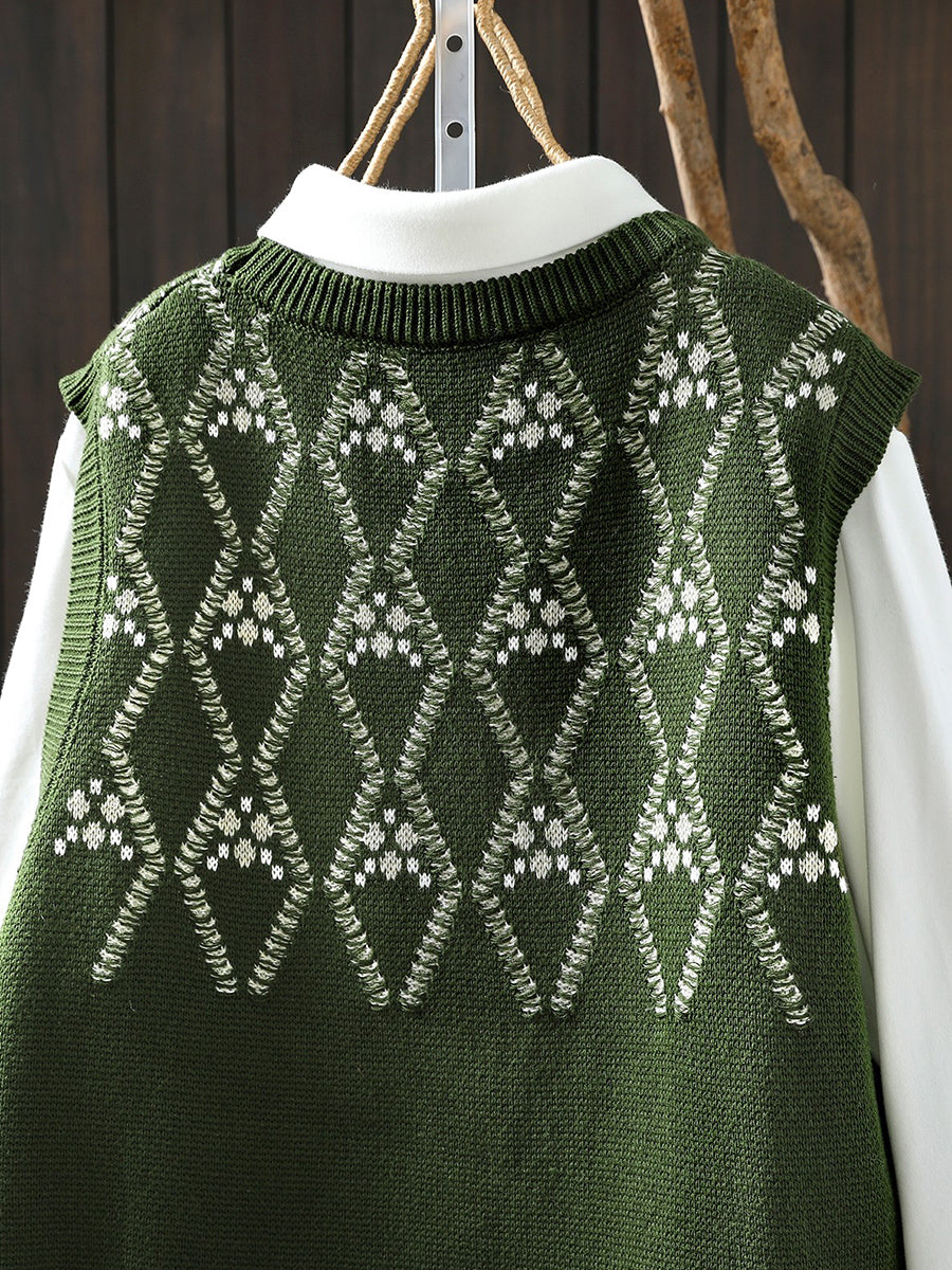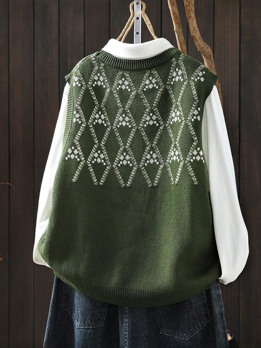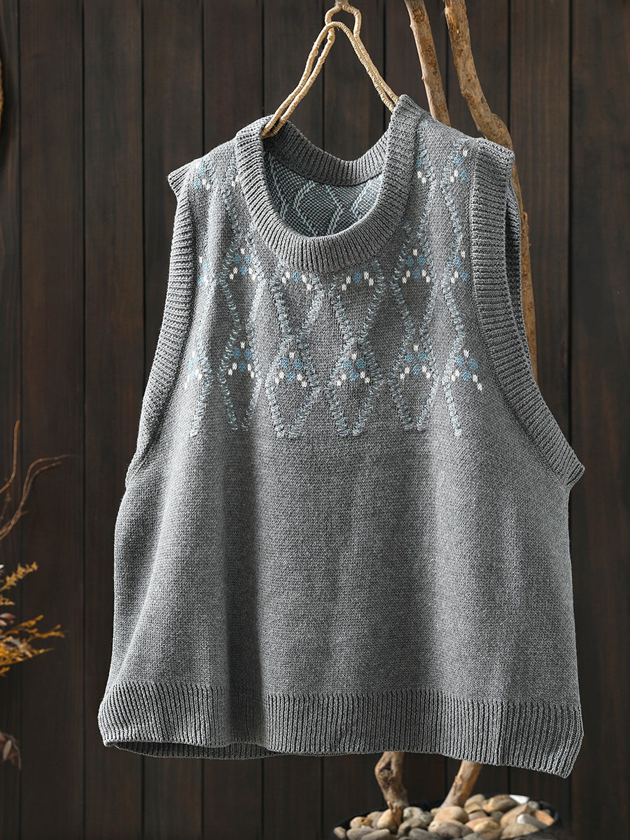 Prjónað vesti fyrir konur, listrænt með rhomboids og O-hálsmáli