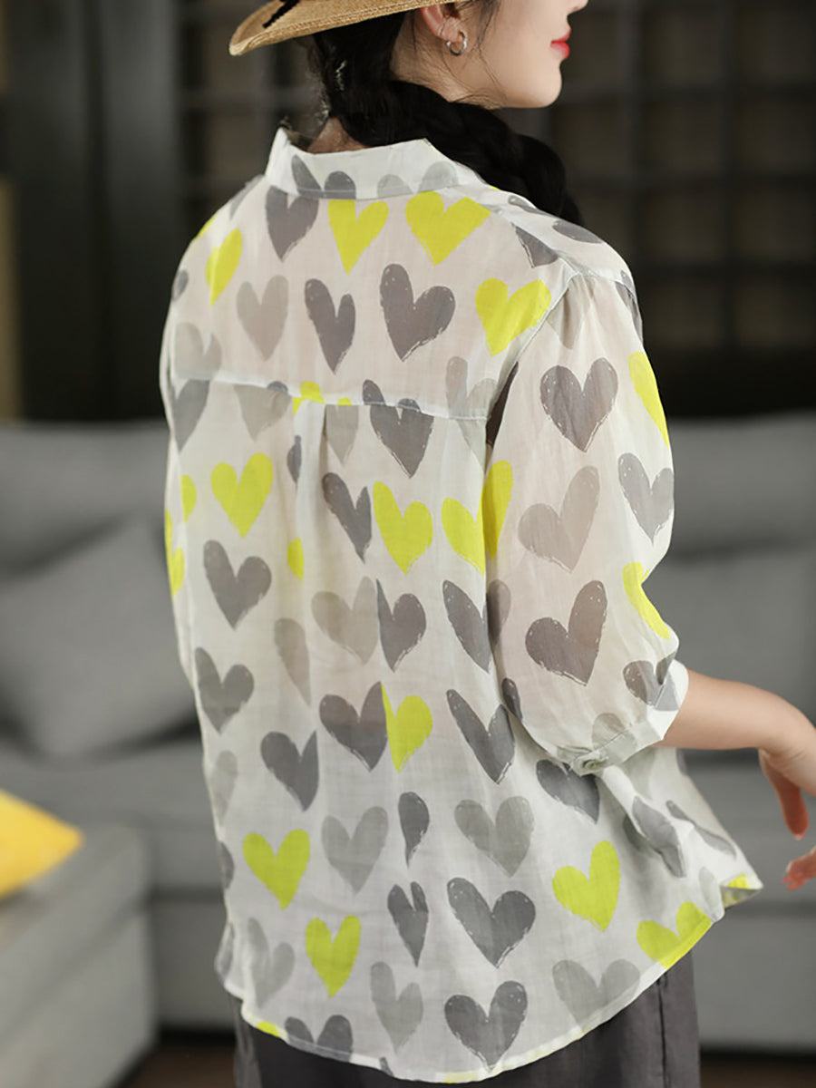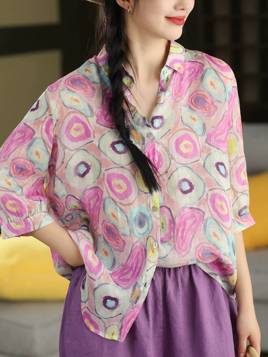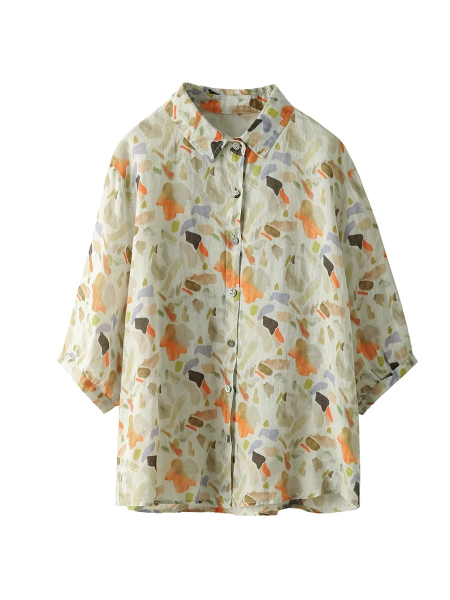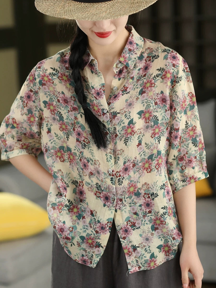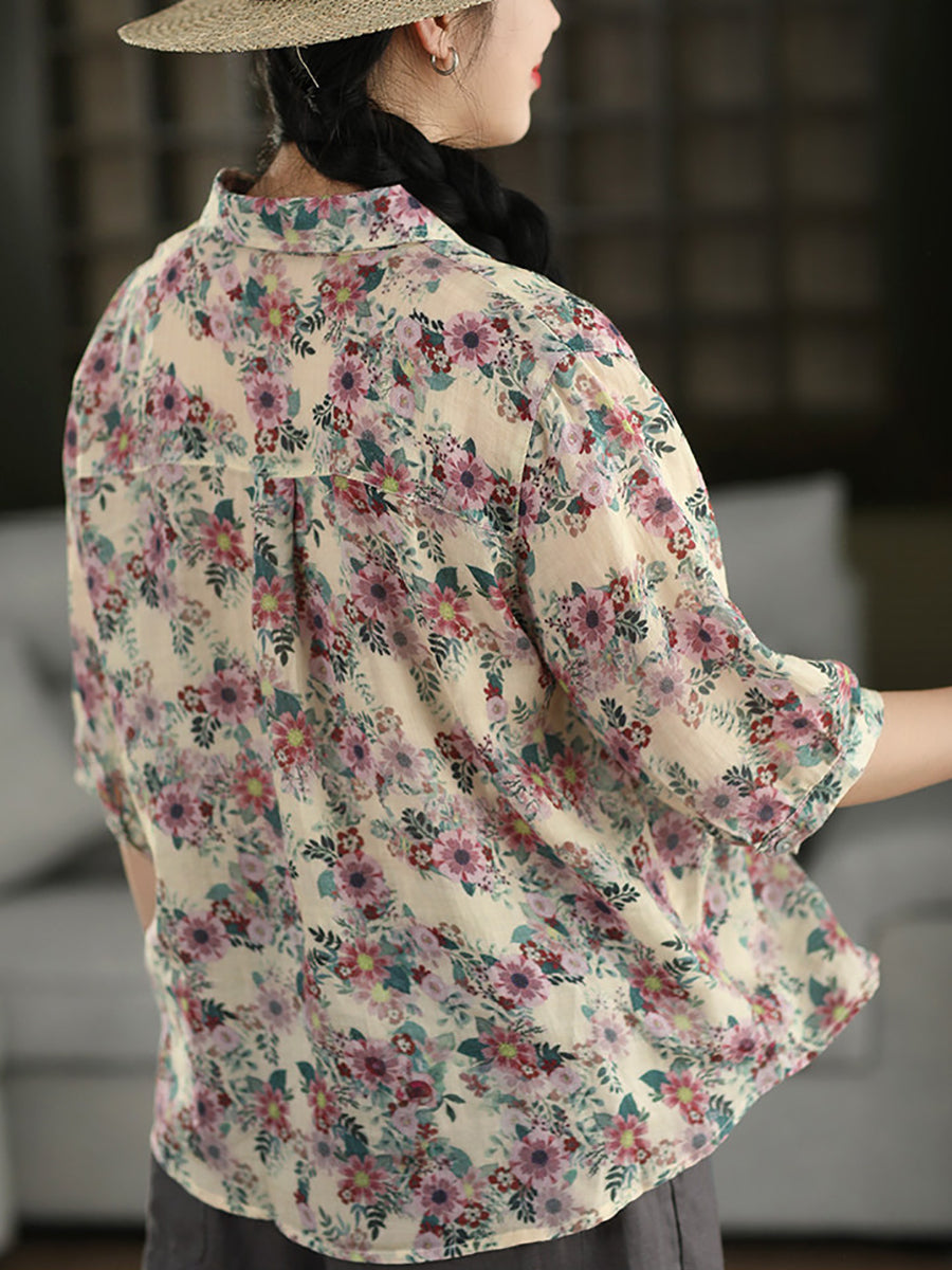 Sumarblússa fyrir konur úr vintage blómum úr 100% ramíi