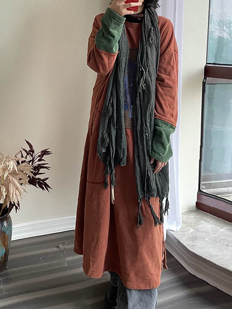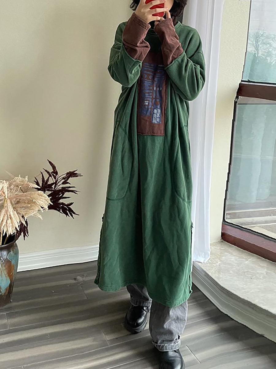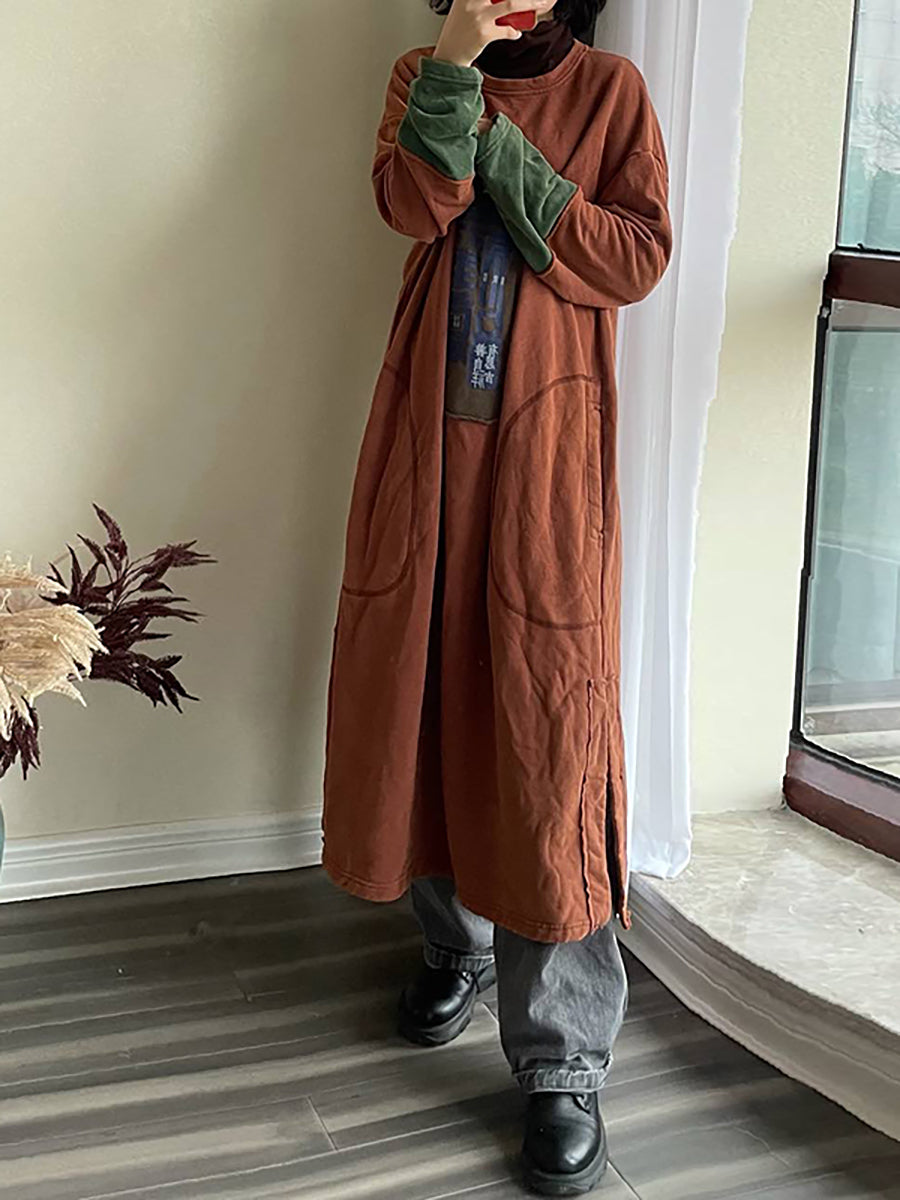 Abito lungo a maniche lunghe con tasca patchwork in cotone taglie forti
