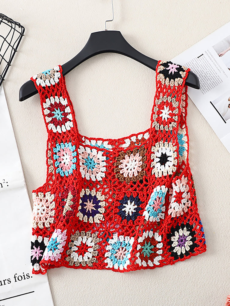 Gilet lavorato a maglia fatto a mano con fiori estivi artistici da donna