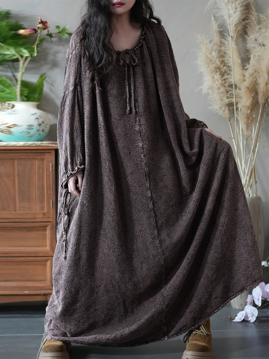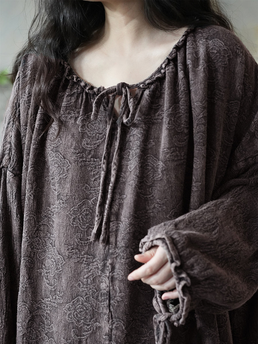 Abito da donna in lino 100% con scollo a V in jacquard retrò autunnale