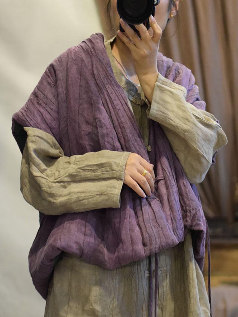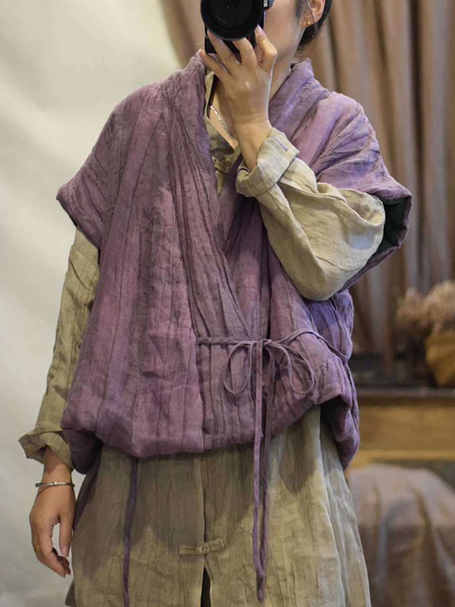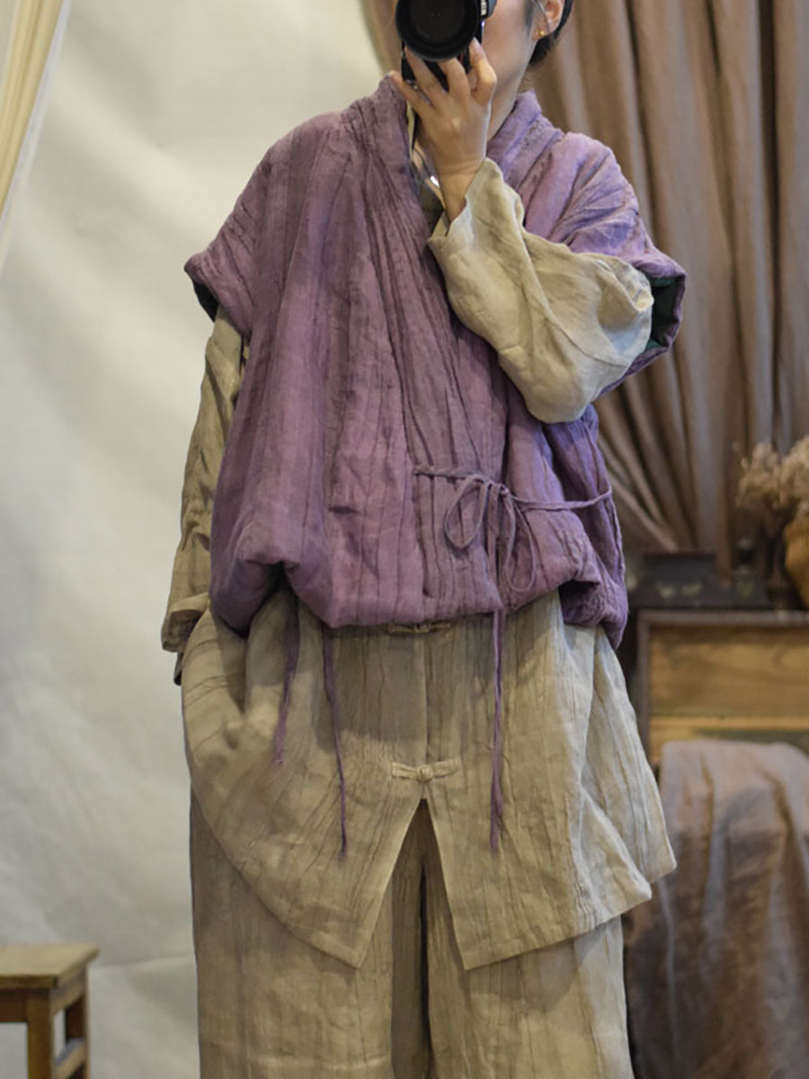 Cappotto da donna in gilet di lino solido vintage retrò con scollo a V
