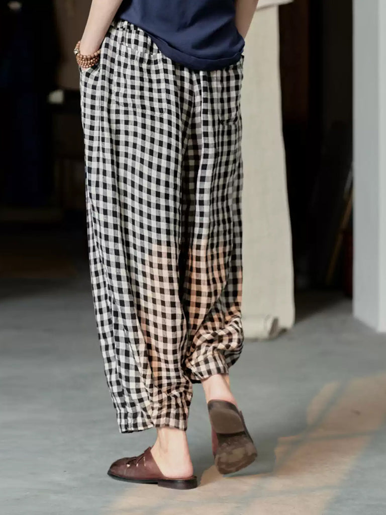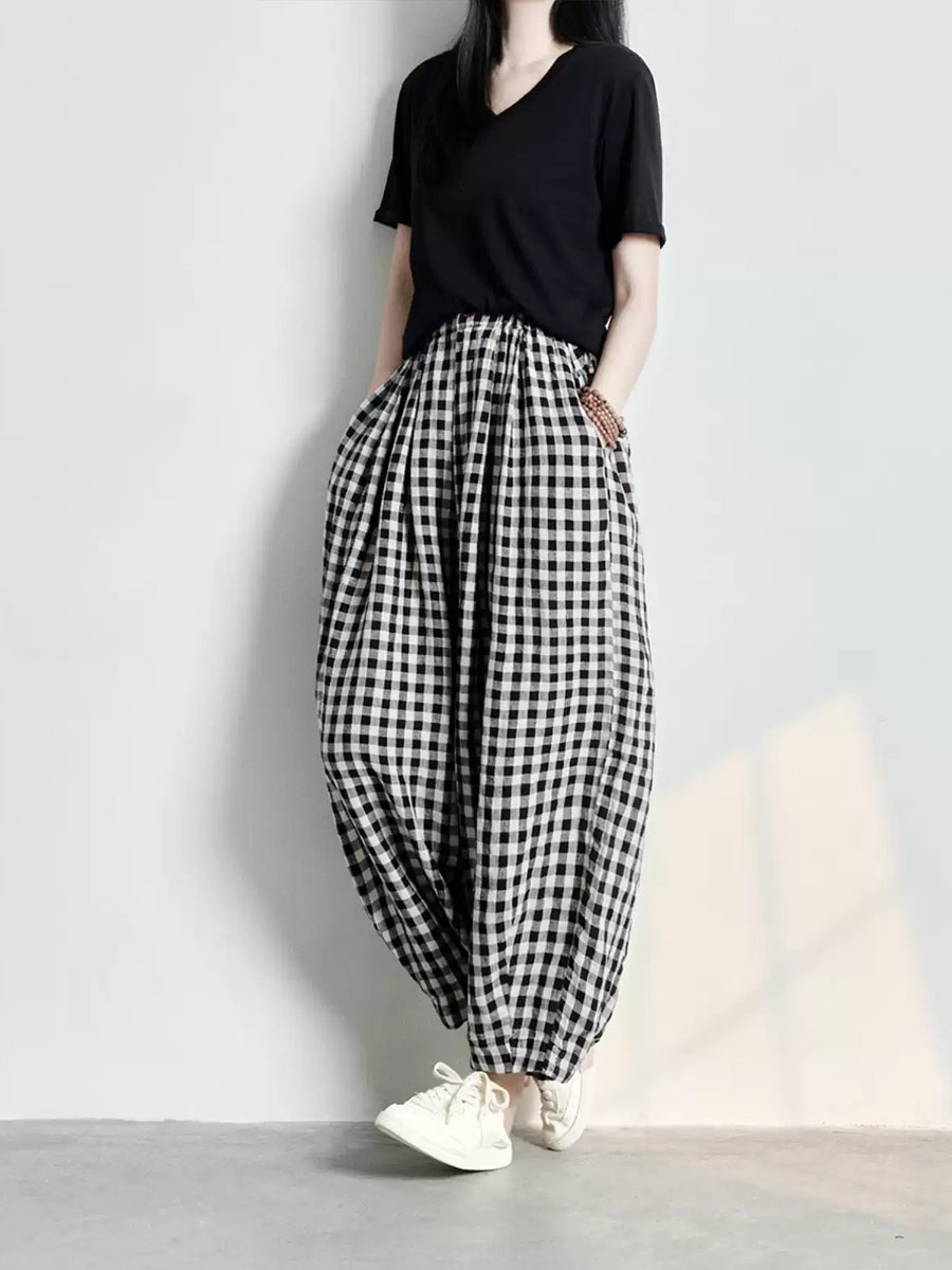 Pantaloni harem larghi in lino a quadri casual primaverili da donna