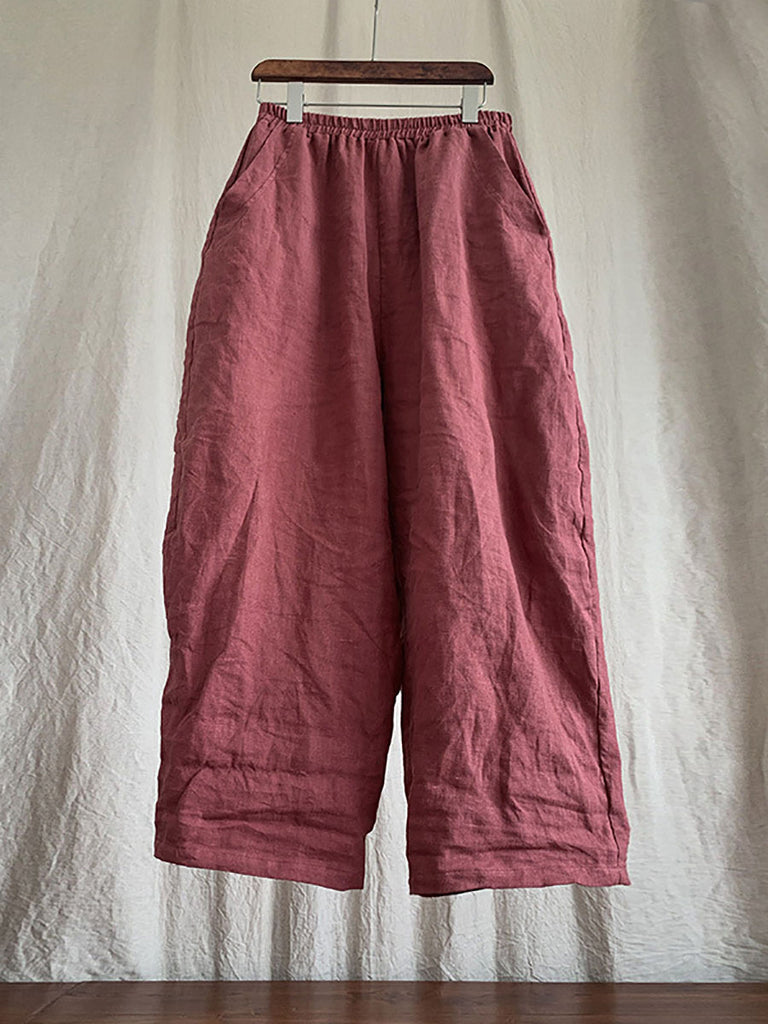 Pantaloni di lino in vita elastica allentata solida casual da donna taglie forti