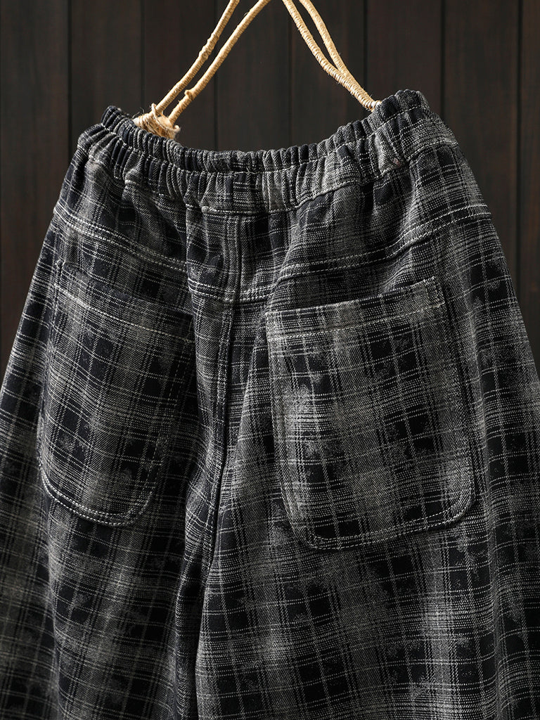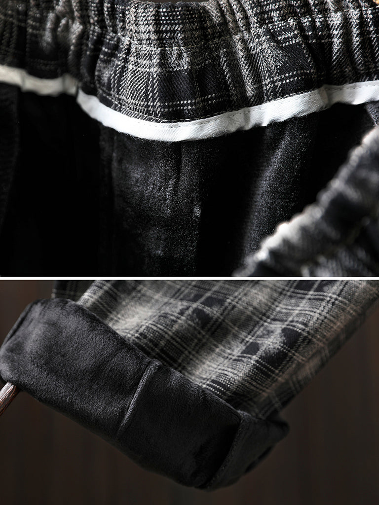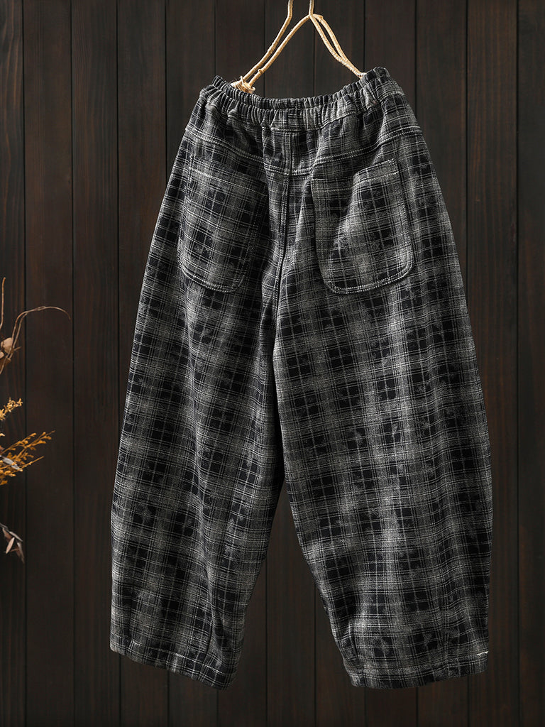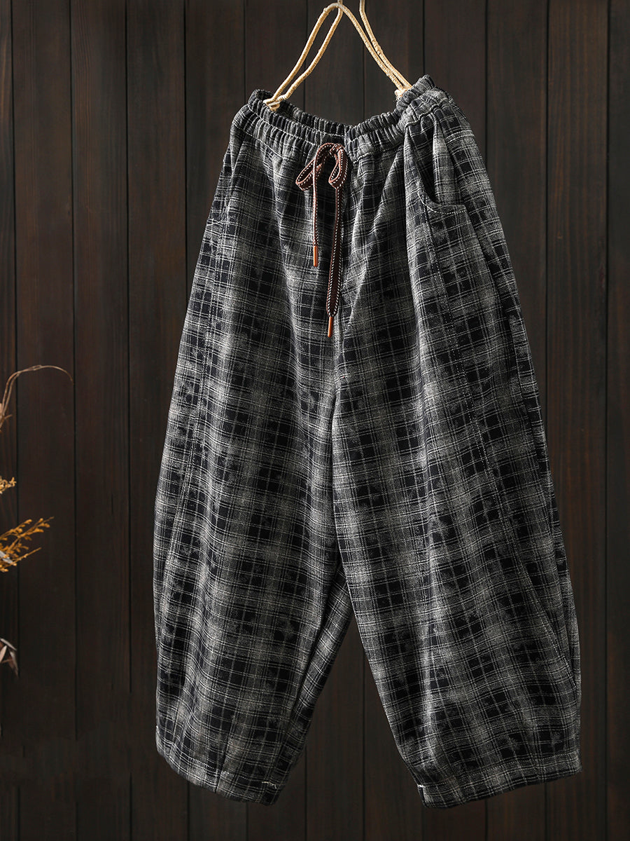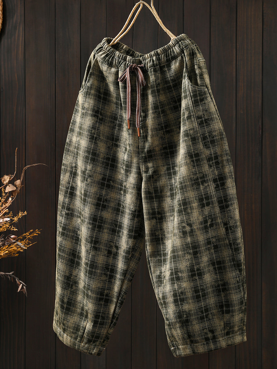 レディース 冬 レトロ チェック柄 フリース裏地 ハーレムパンツ