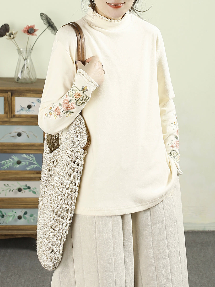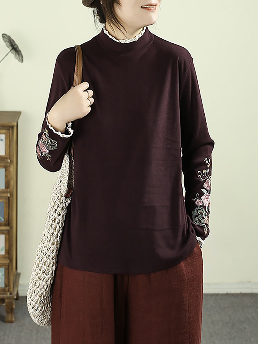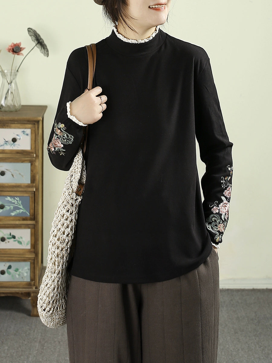 レディース 冬 アーティスティック 刺繍 ハーフタートルネック ブラウス
