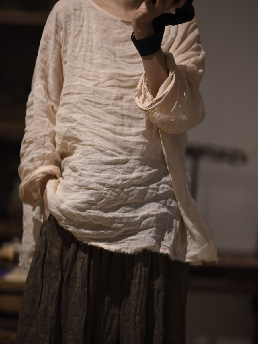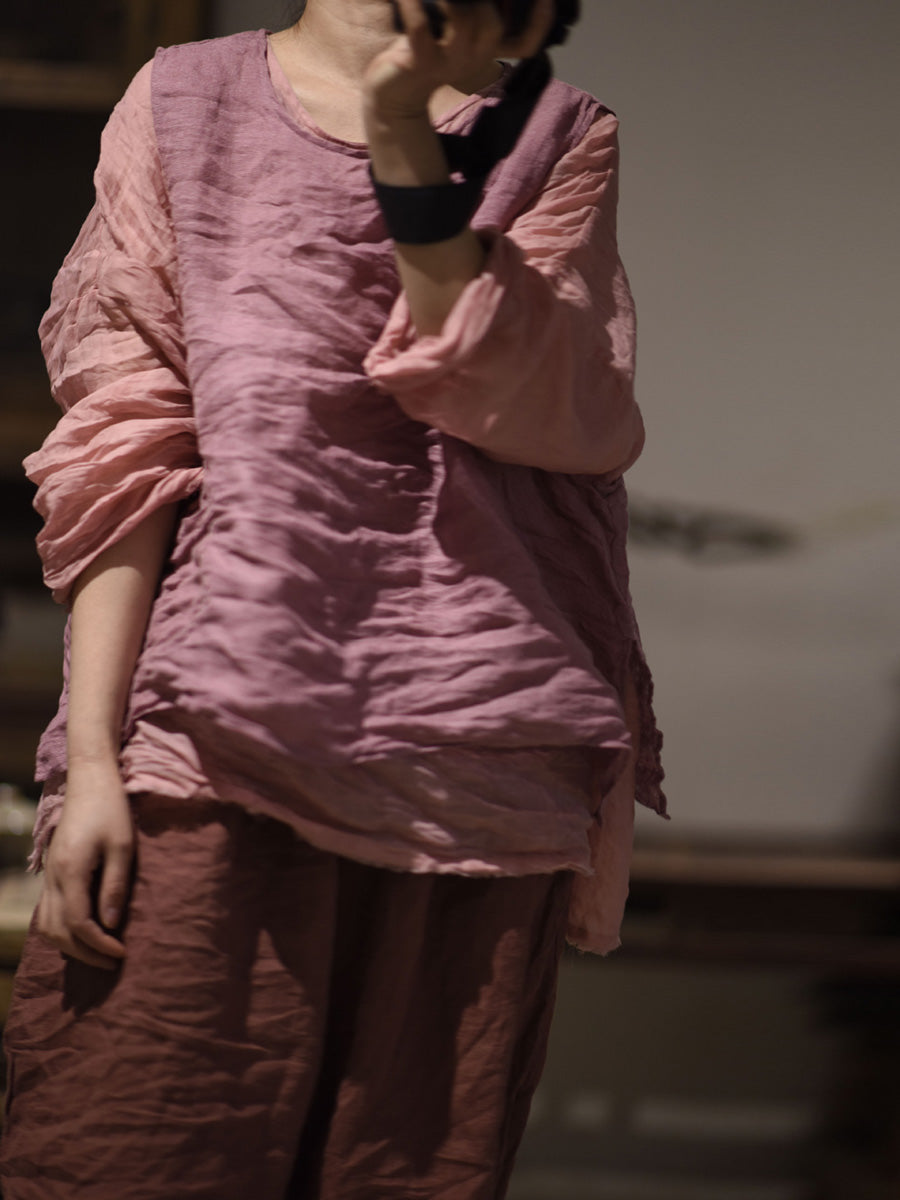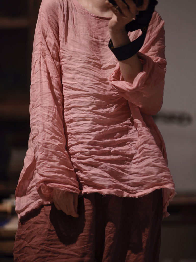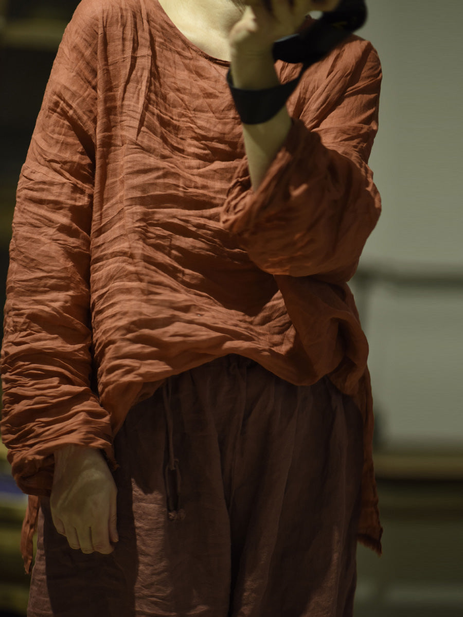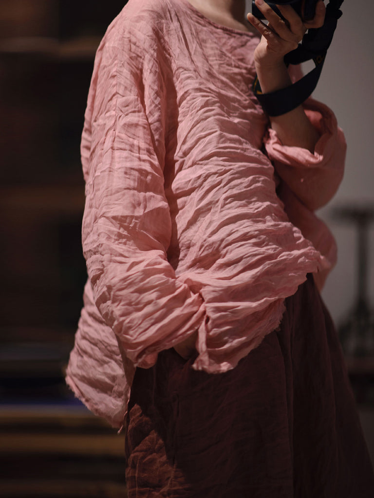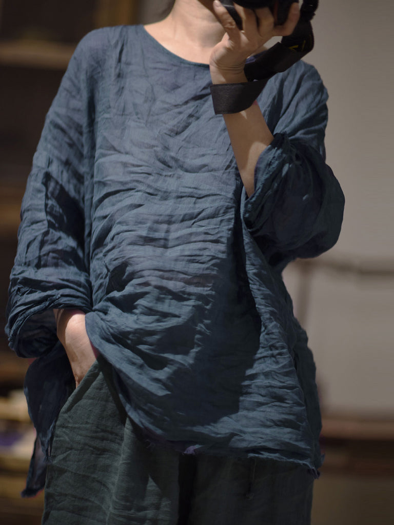 Dames Herfst Effen Vintage O-hals Ramie Blouse