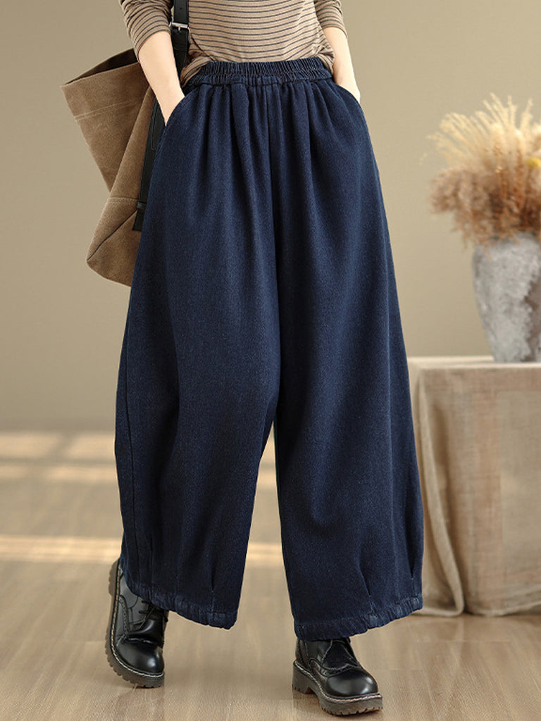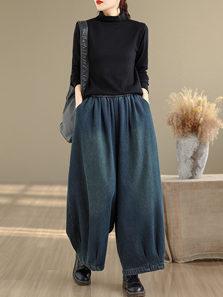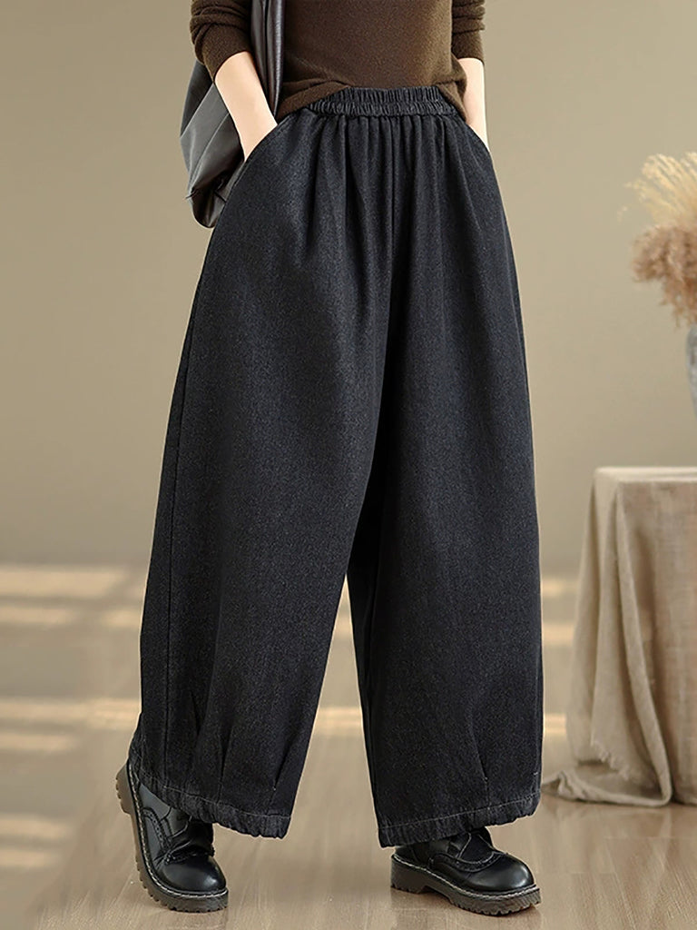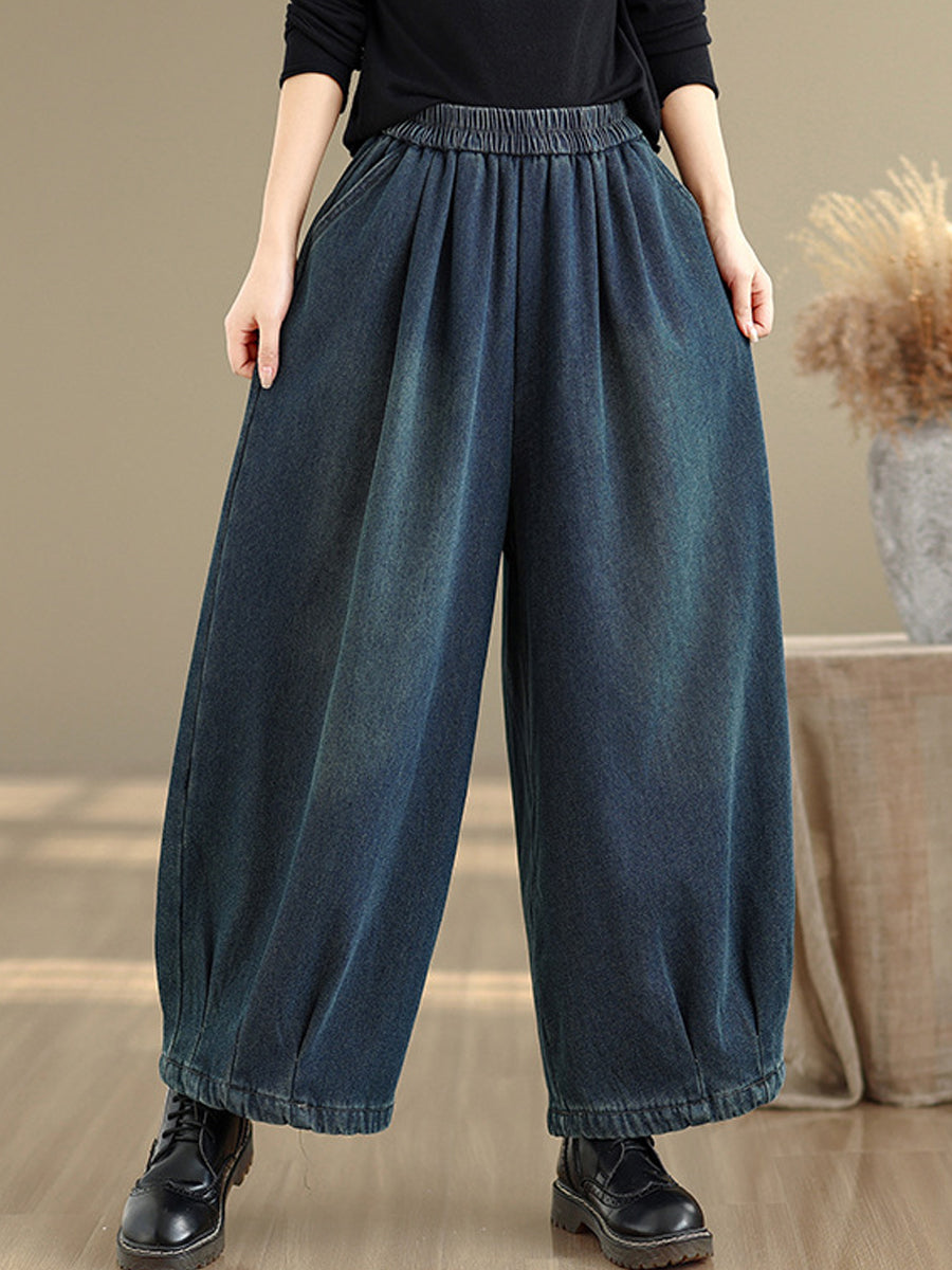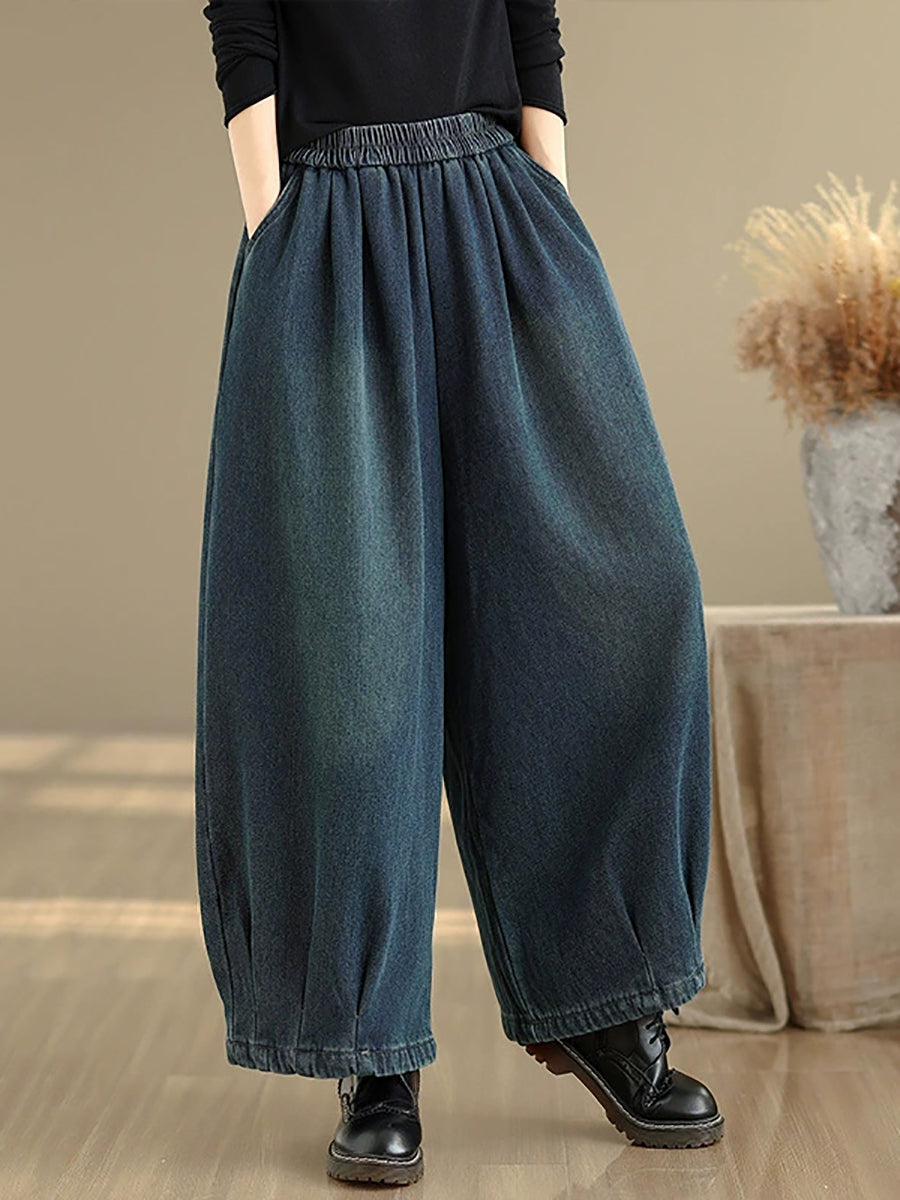 Dame vinter retro denim fleeceforede vide benbukser