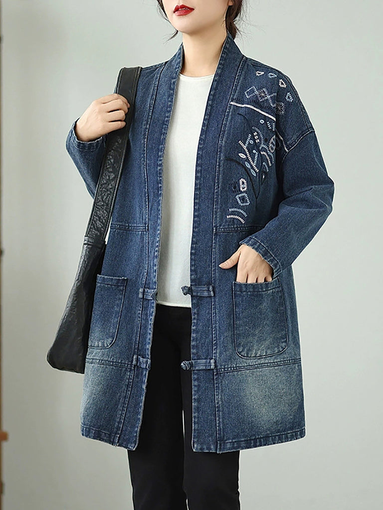 Dame Vintage Høst Broderi Denim V-hals Frakk