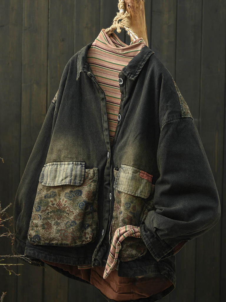 Kvinners etniske blomsterdenim skjøtet bomullspolstret frakk