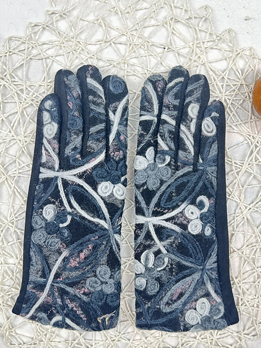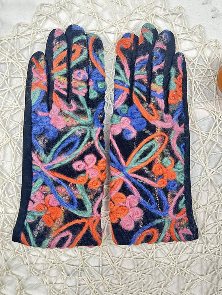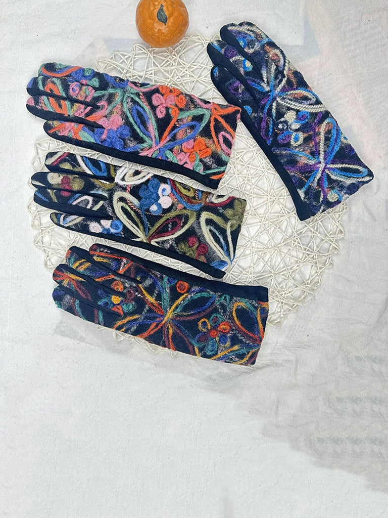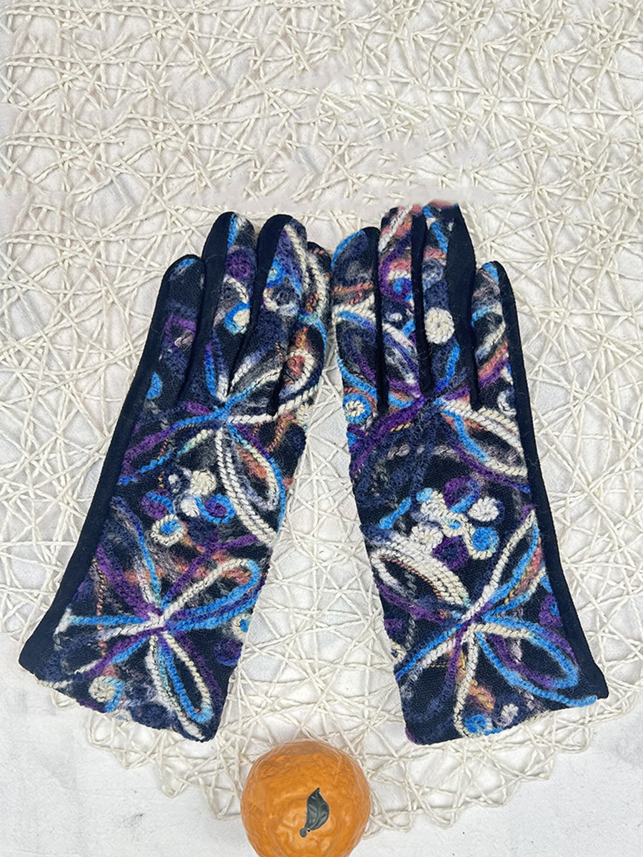 Strikkede varme sykkelhansker til dame med etnisk blomst