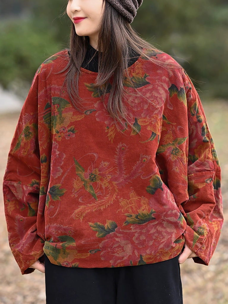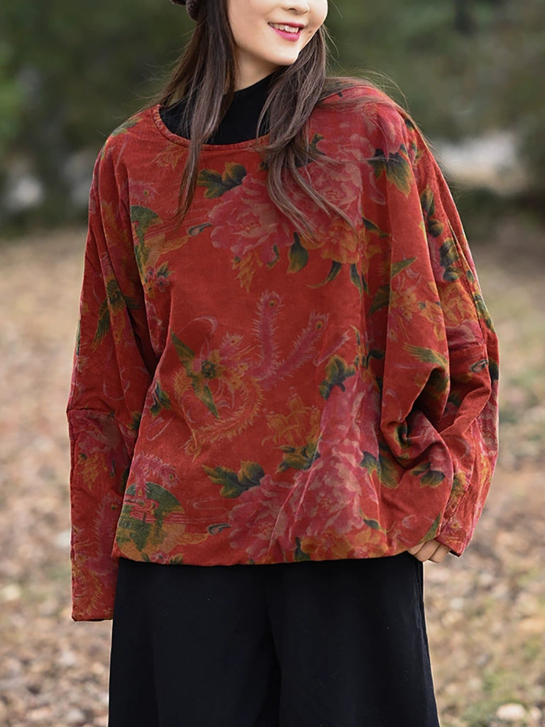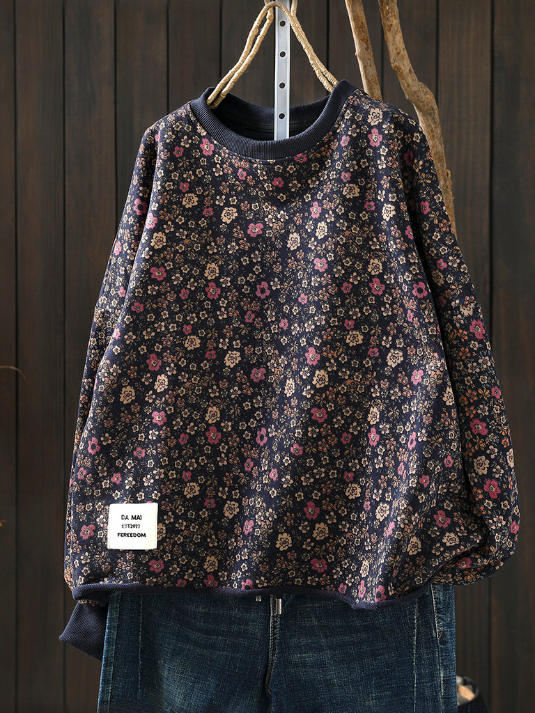 Kunstnerisk vinterbluse med O-hals og blomsterprint i 100 % bomull for kvinner