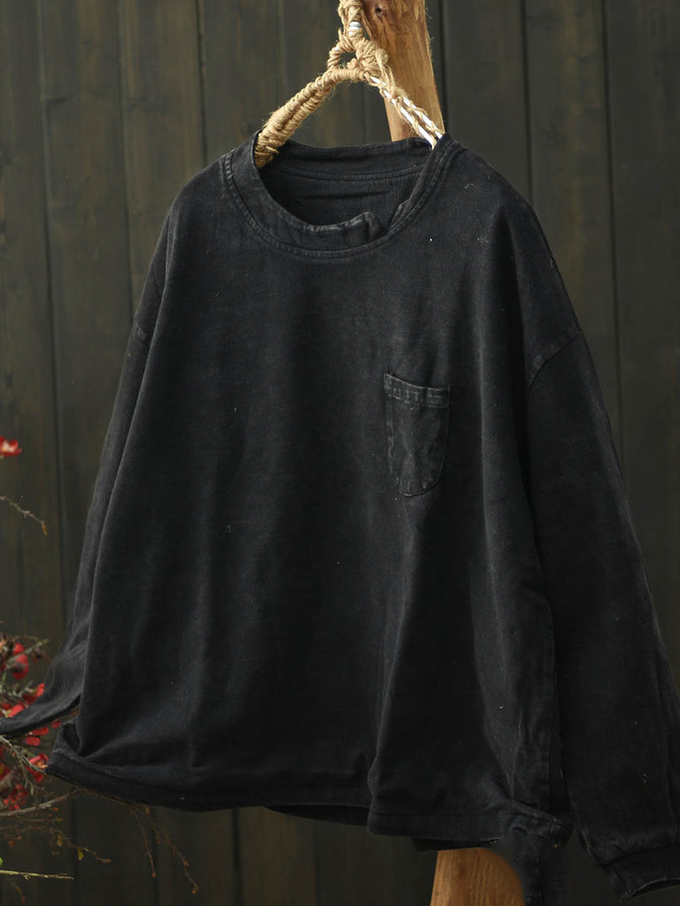 Dame vinter kunstnerisk ren farge O-hals bomullsbluse