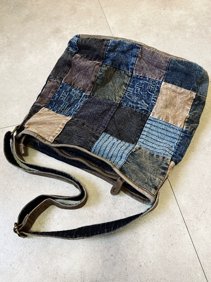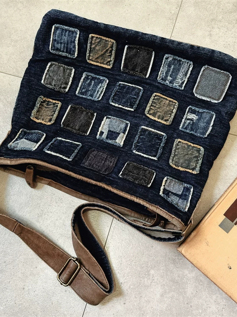 Vintage denim blomstermønster lappeteppe skjøtet skinnveske