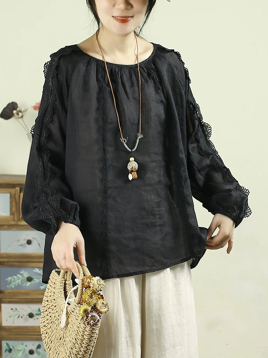 Kunstnerisk vårskjorte med blonder og O-hals i 100 % ramie for kvinner