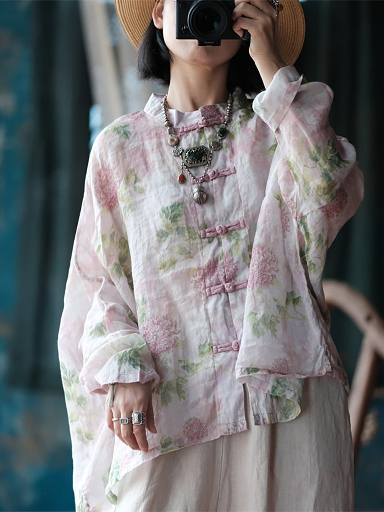 Kvinner etnisk vårblomst stativ krage linskjorte
