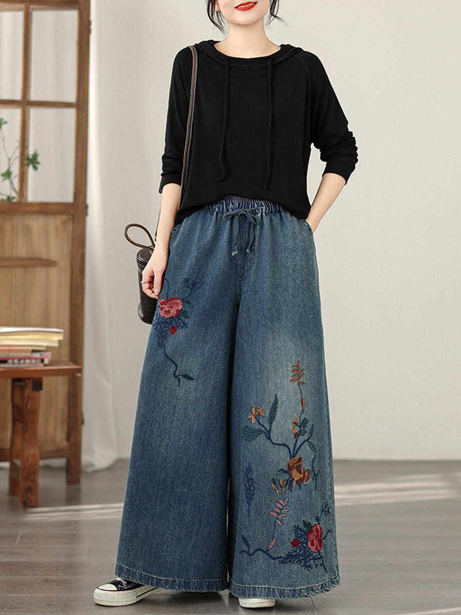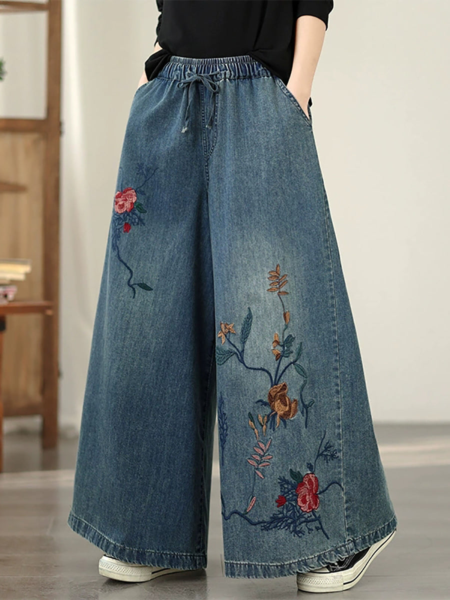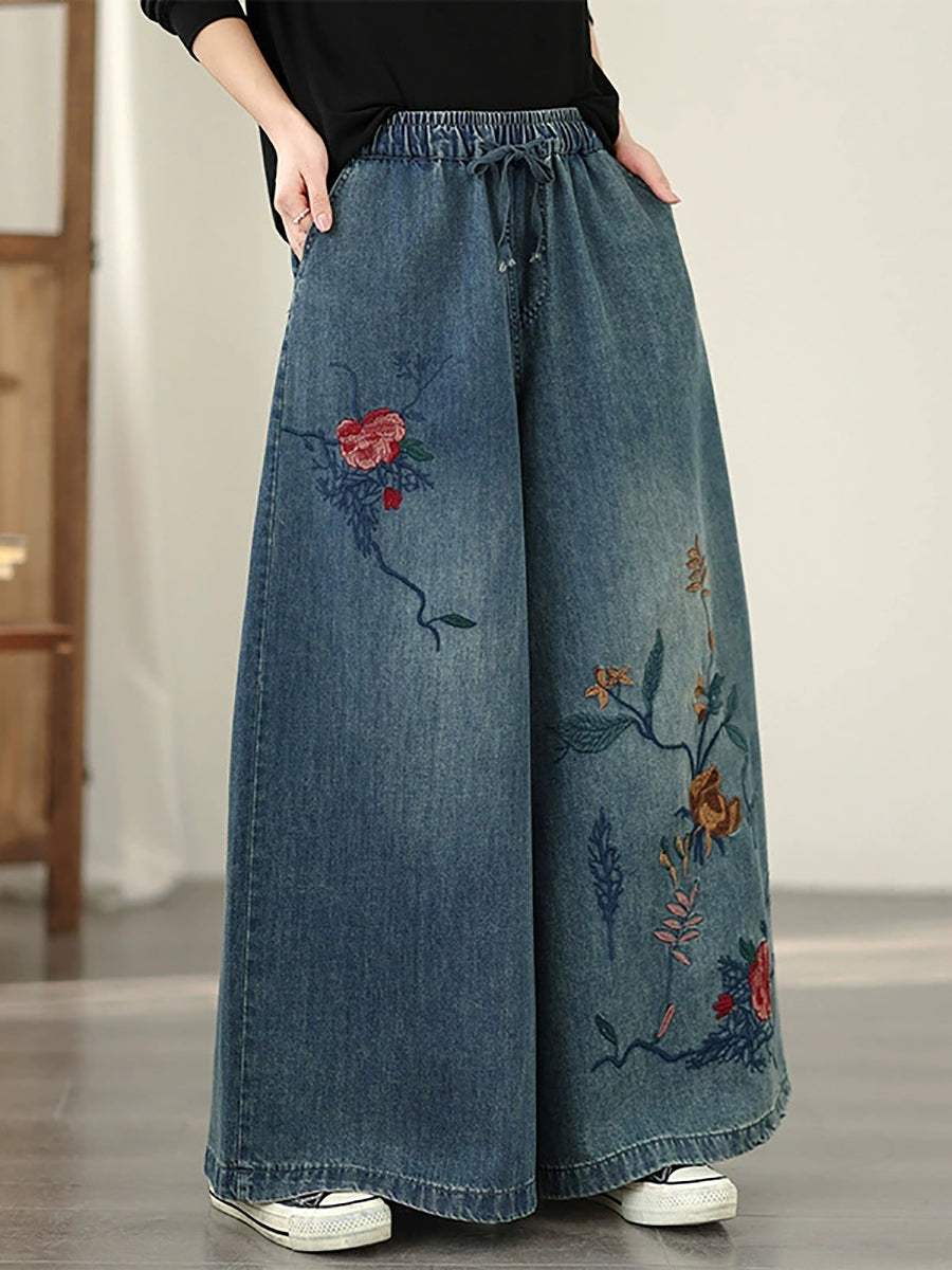 Dame Vår Vintage Denim Blomsterbroderi Vide Benbukser