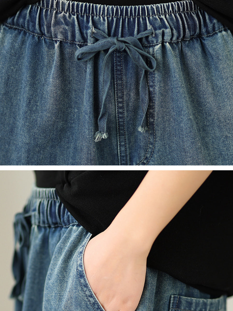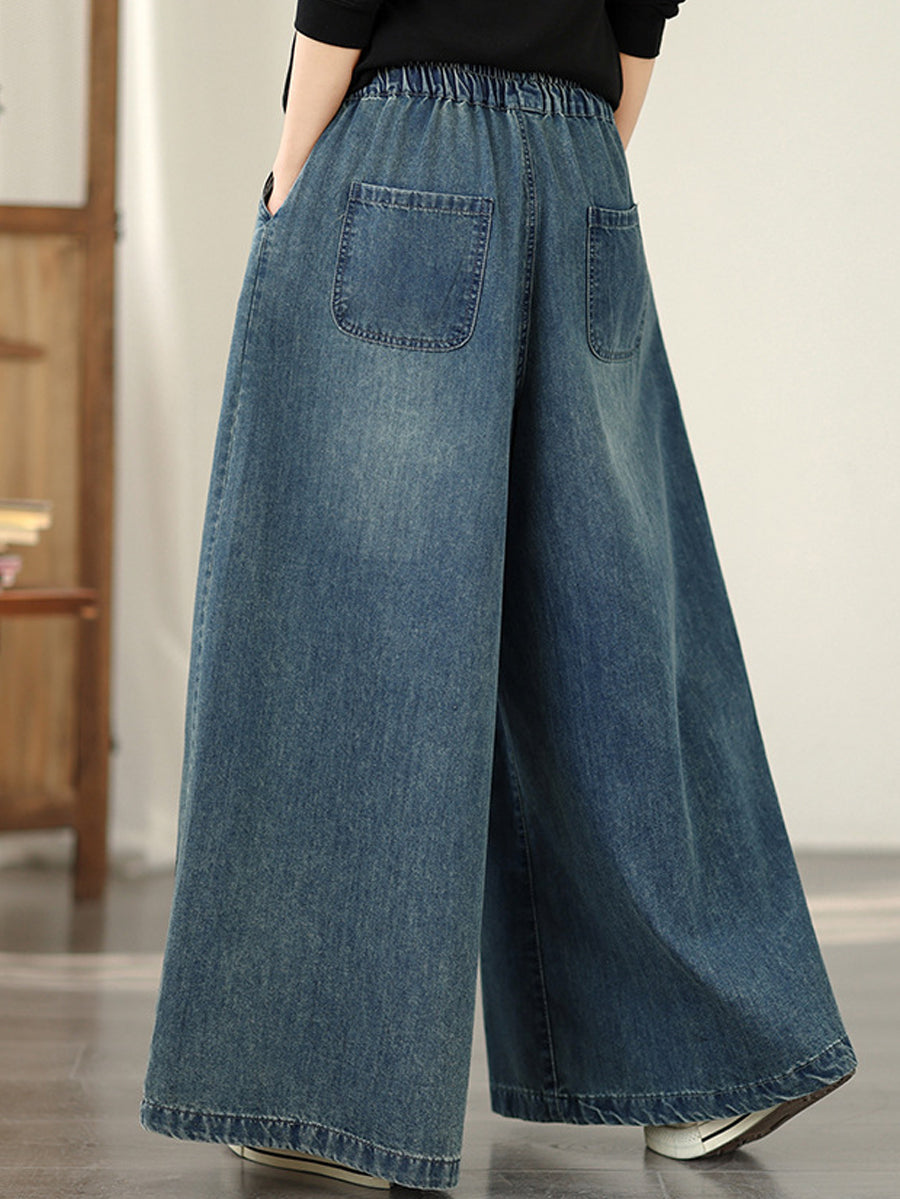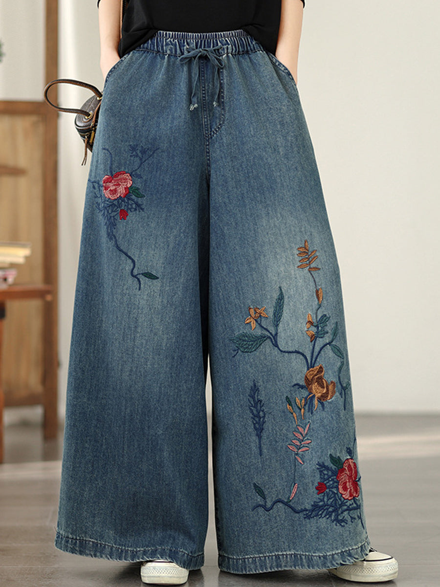 Dame Vår Vintage Denim Blomsterbroderi Vide Benbukser