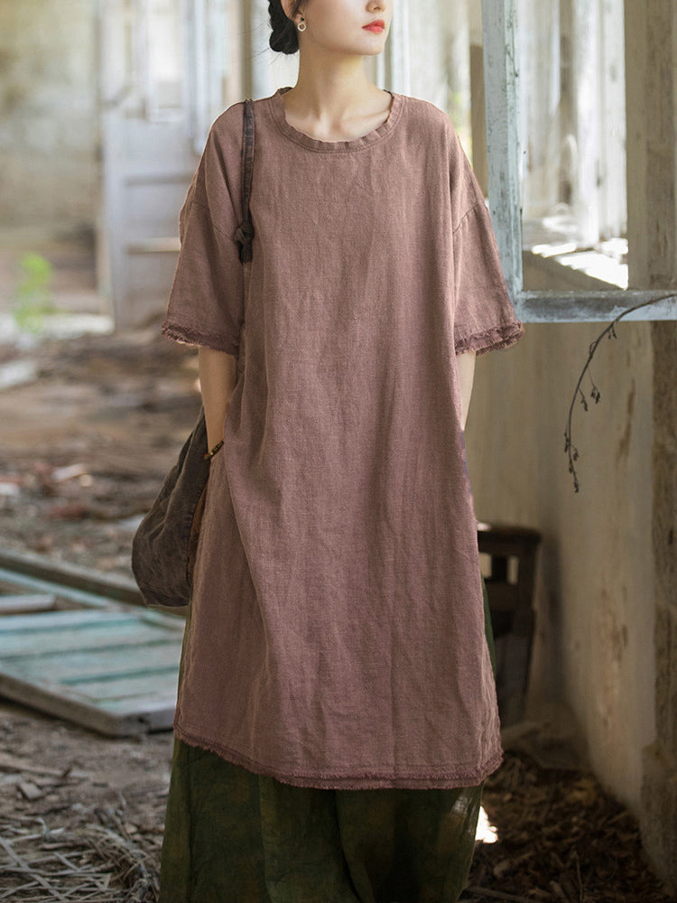 Denne kjolen er designet for å holde deg kjølig om sommeren samtidig som den opprettholder et moteriktig utseende, med dens knelange design, solide mønster, O-hals krage og delt falddetaljer.