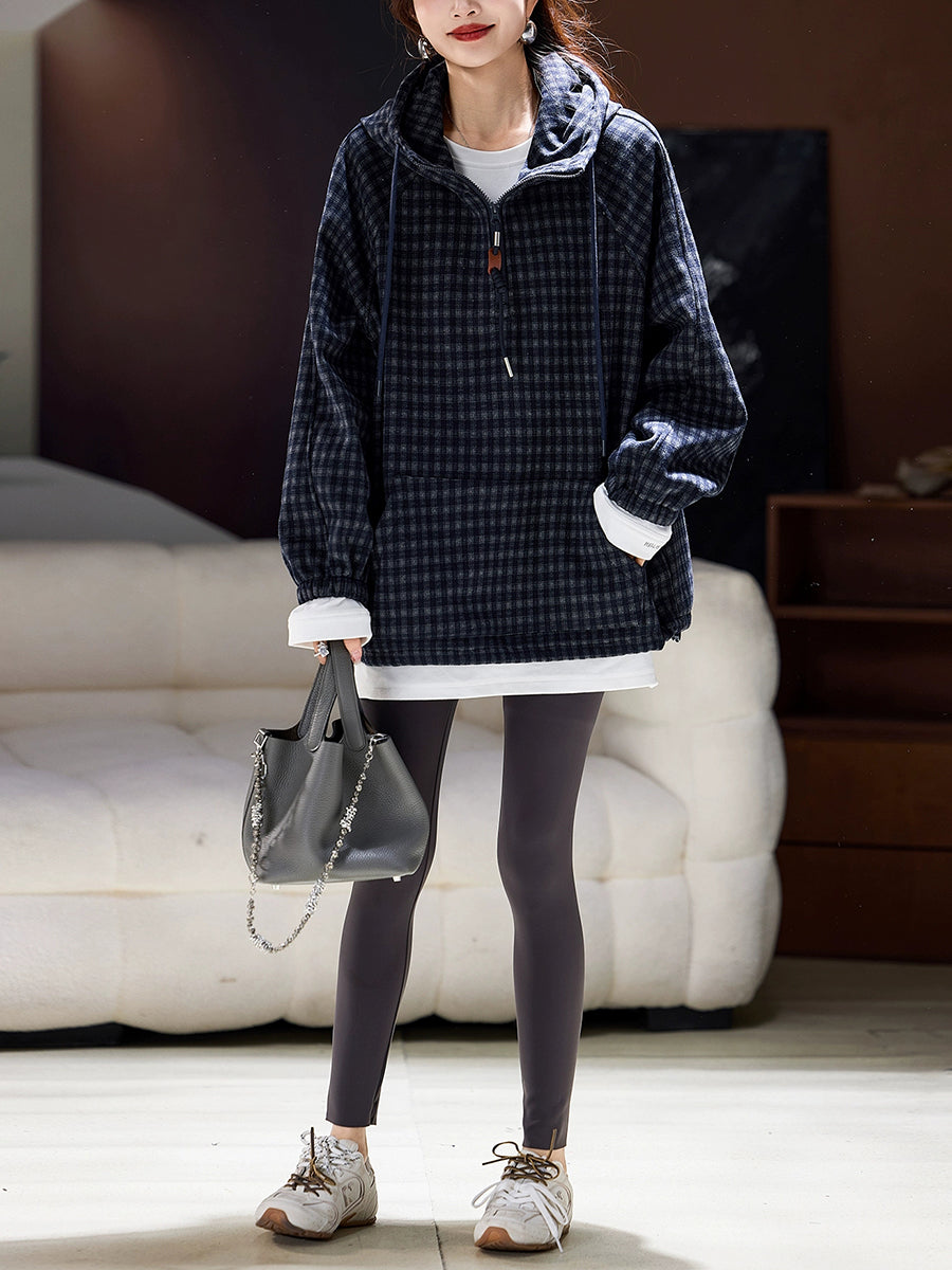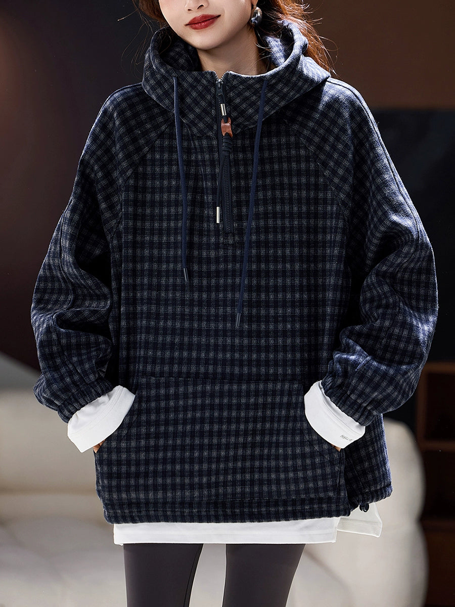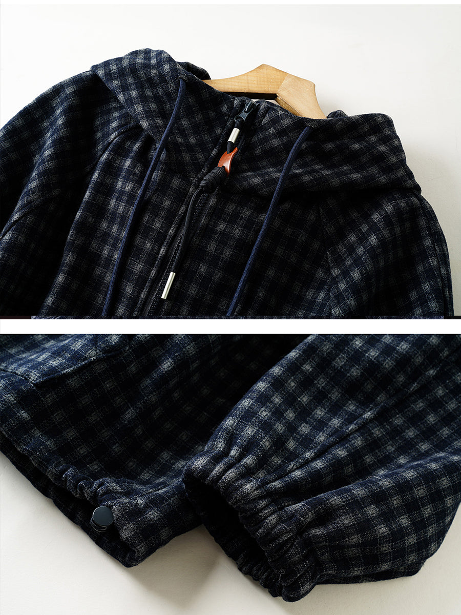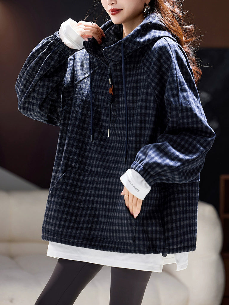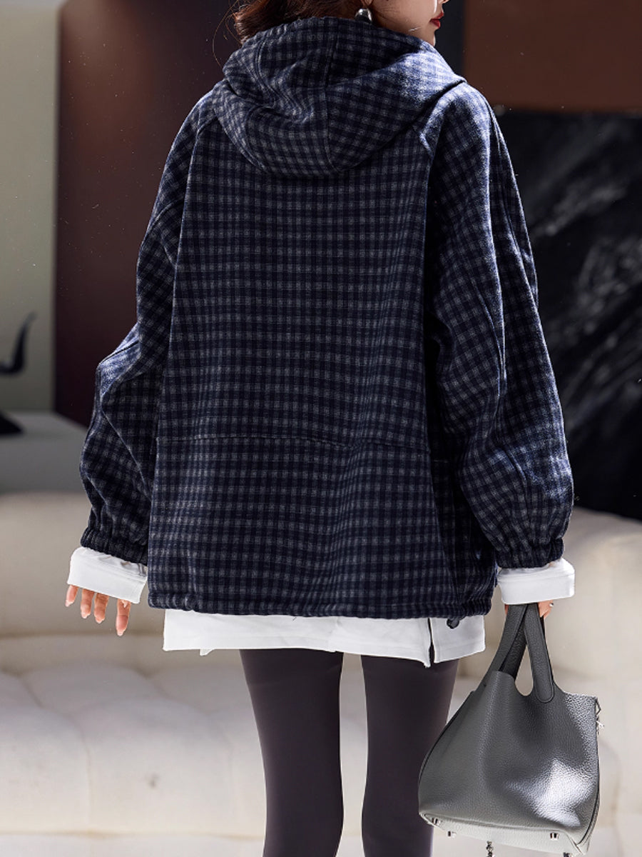 Kvinners vinter casual rutete fleeceforet hettejakke med polstret hette