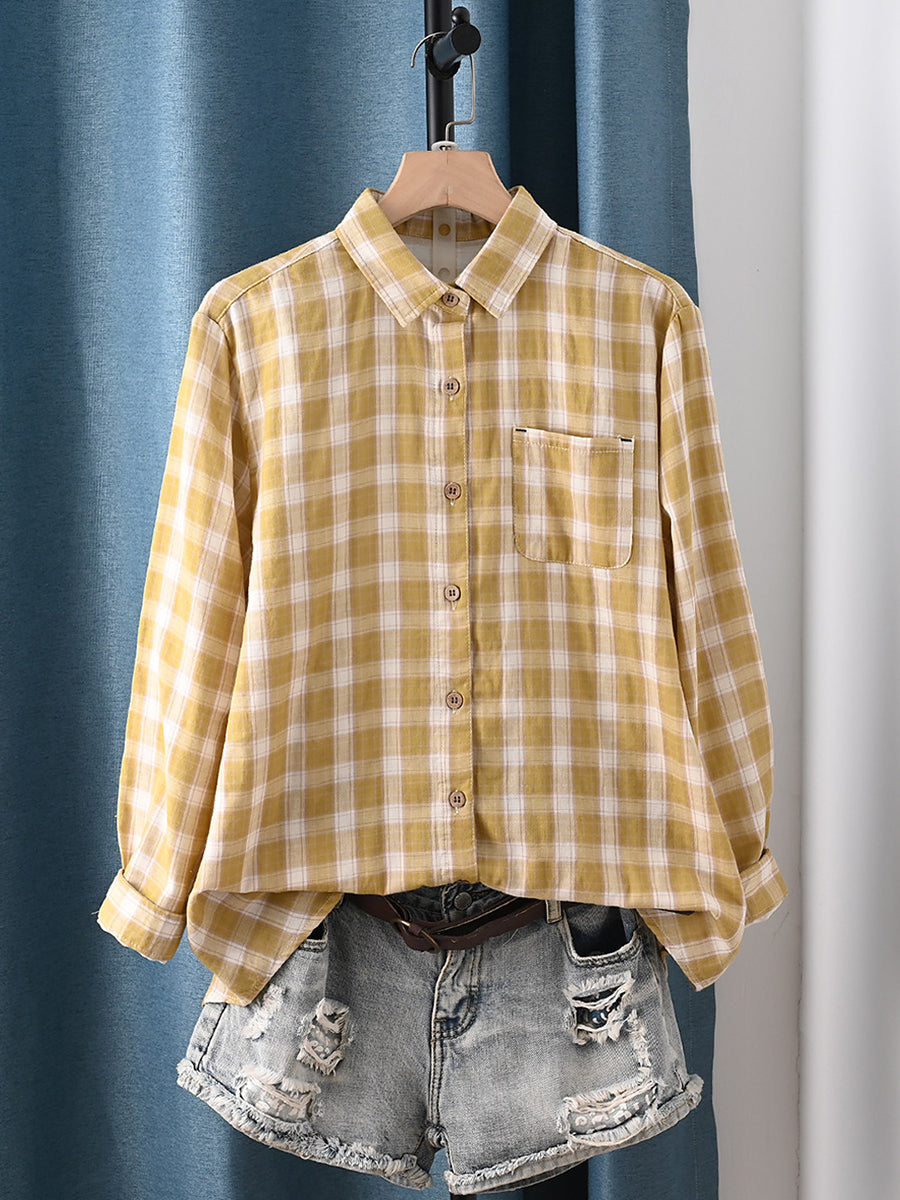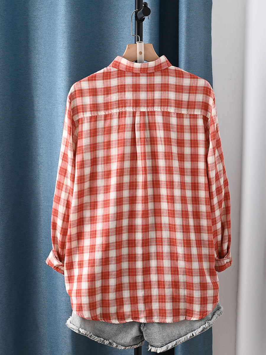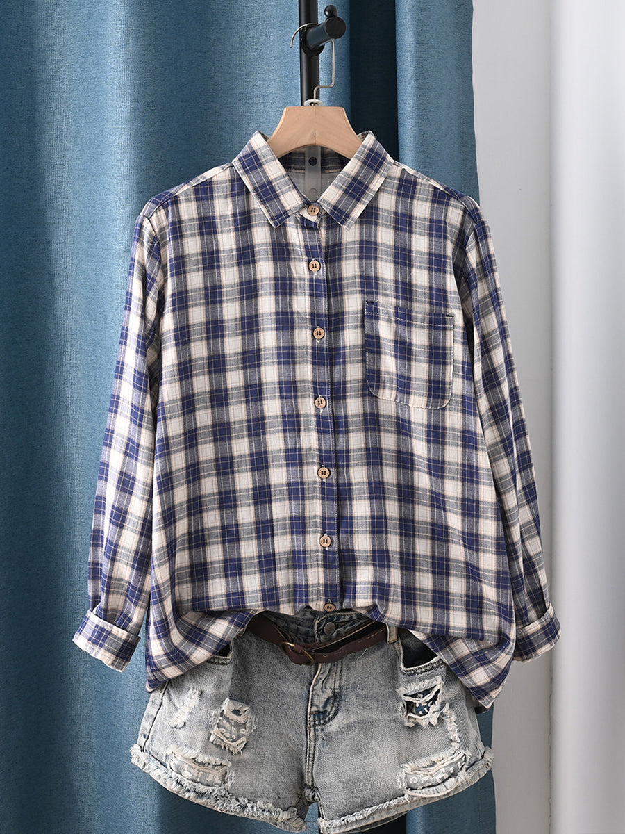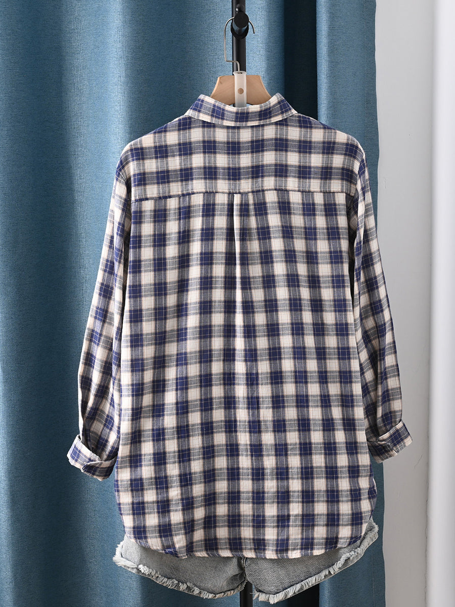Dame vårskjorte med kunstnerisk rutete krage og 100 % bomull