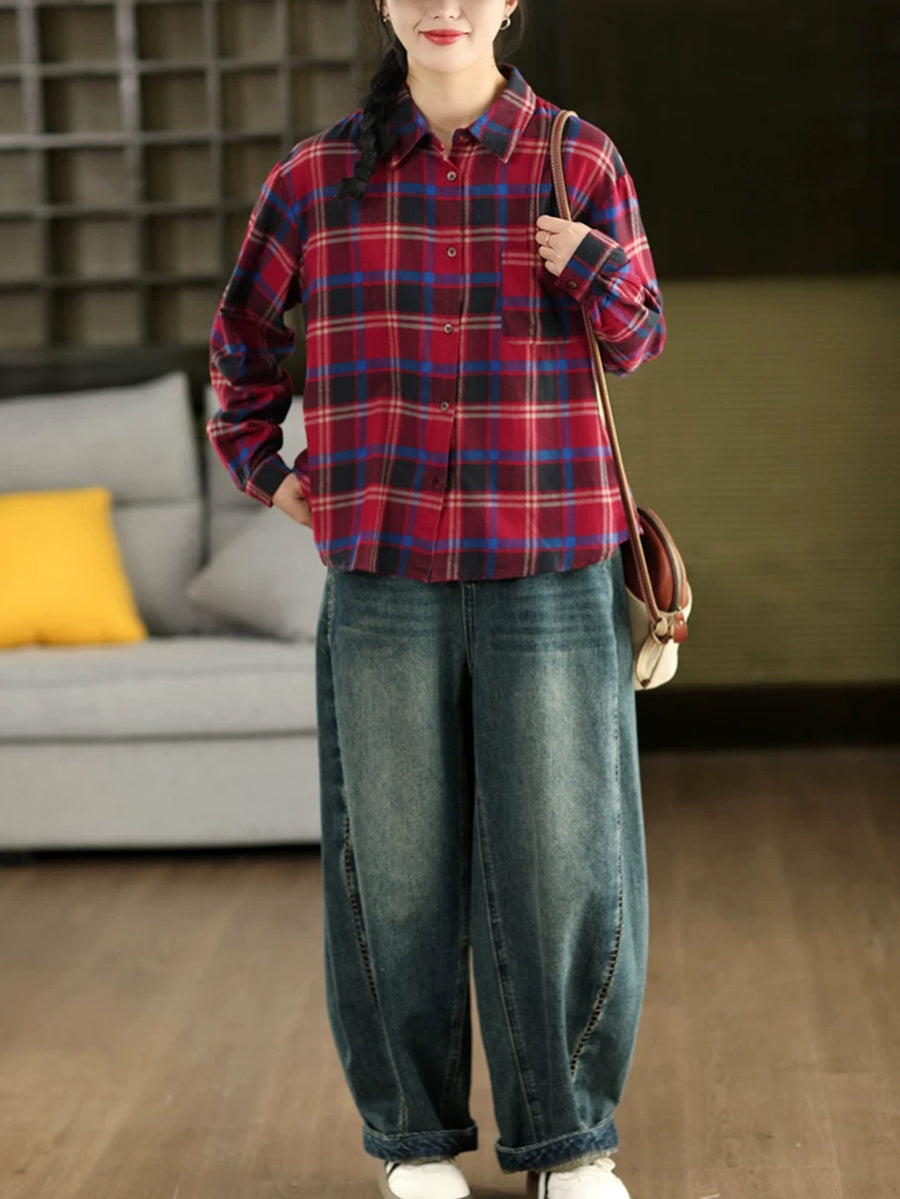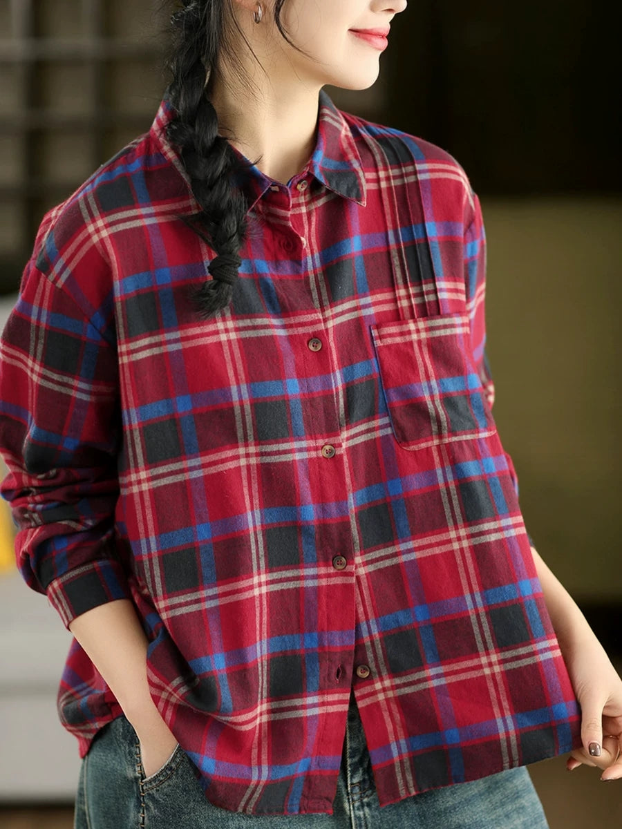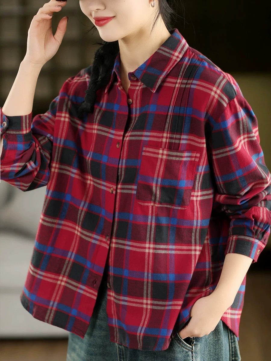 Kunstnerisk rutete vårskjorte med nedfellbar krage for kvinner