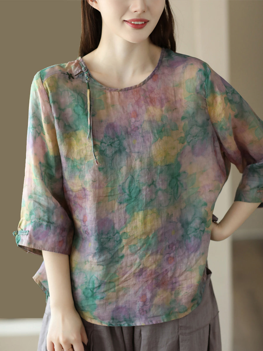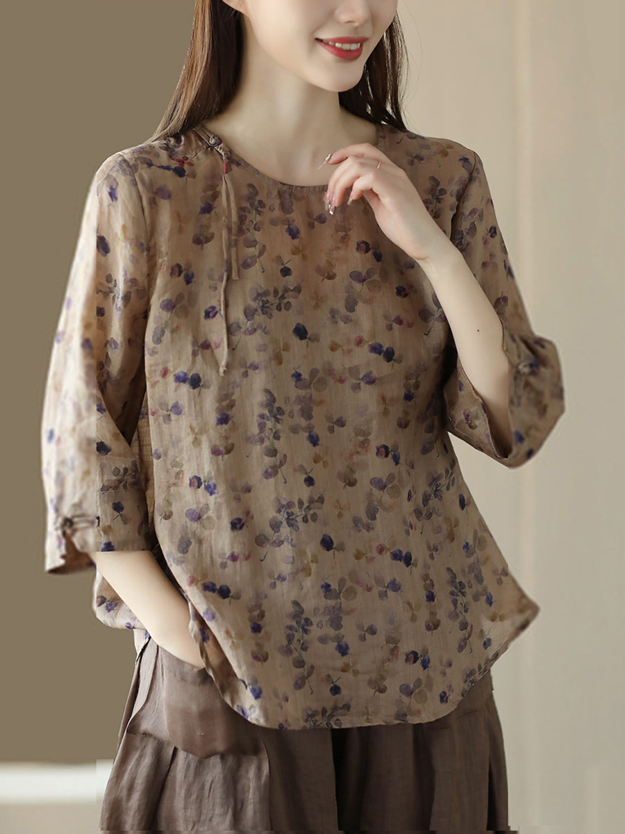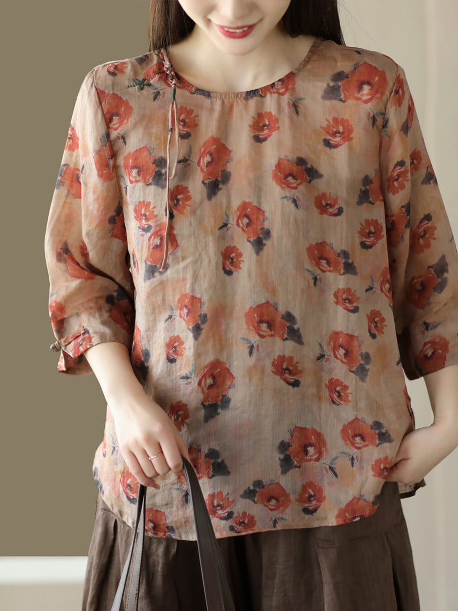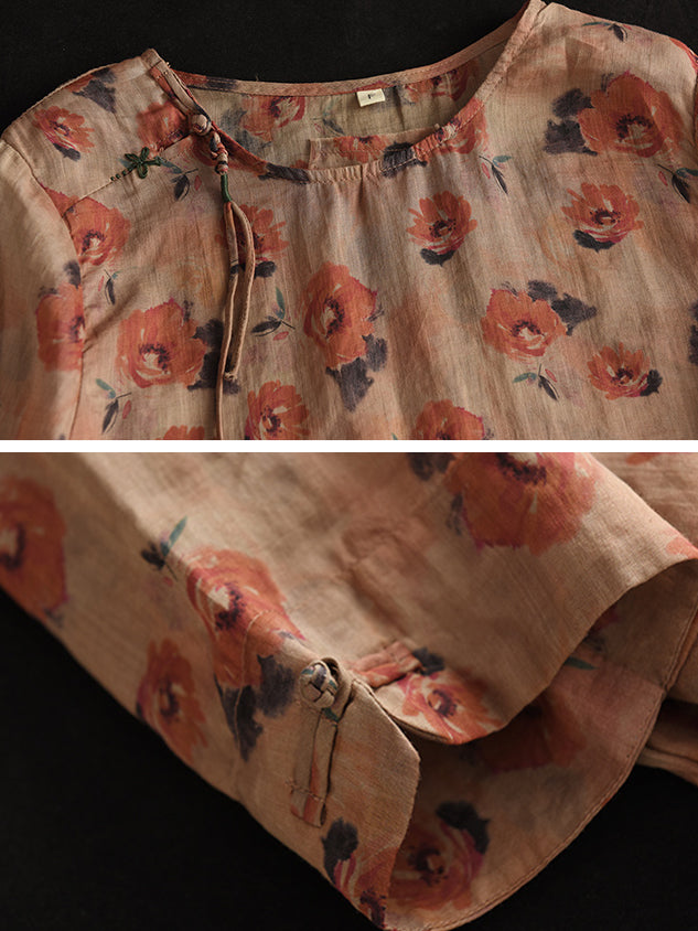 Damska koszula lniana w kwiaty w stylu vintage z żabą