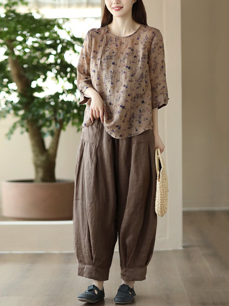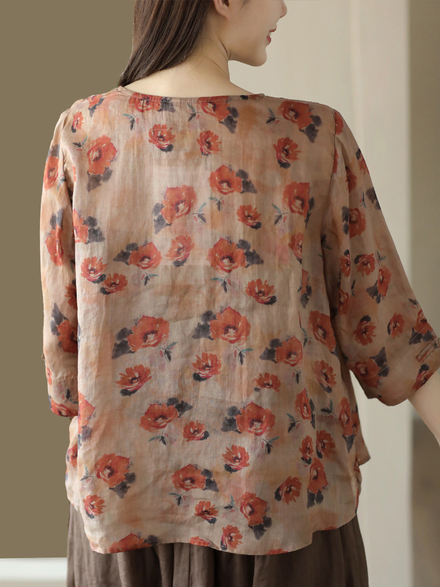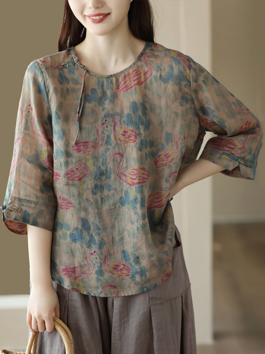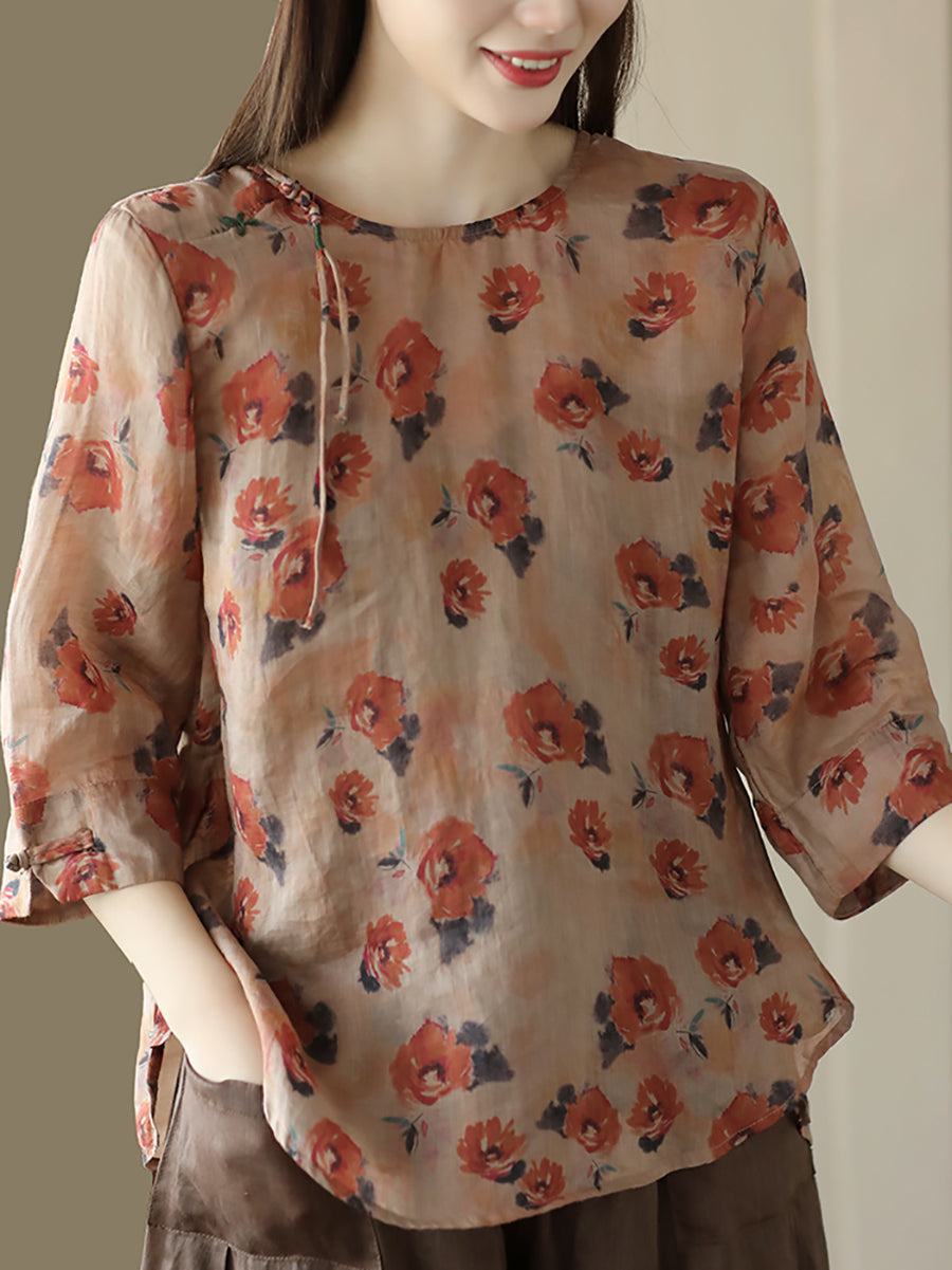 Damska koszula lniana w kwiaty w stylu vintage z żabą