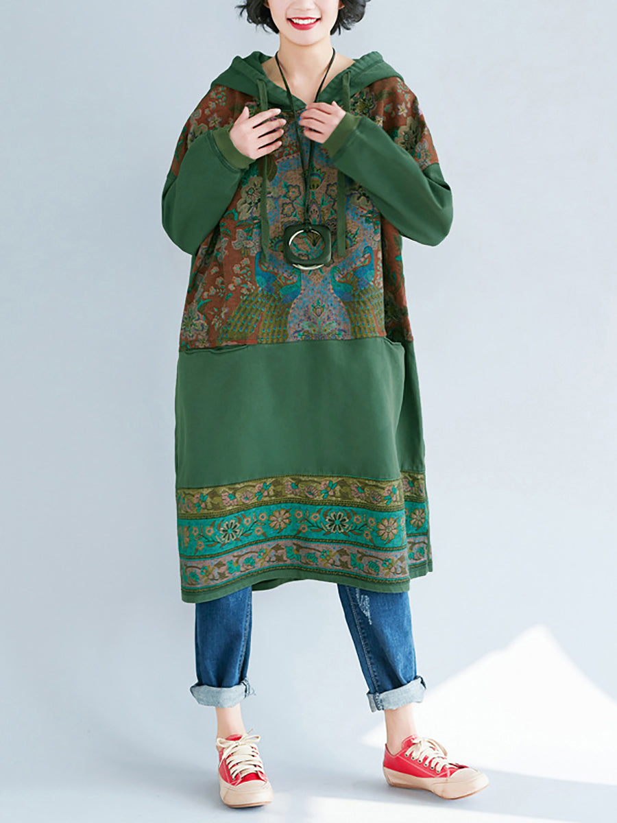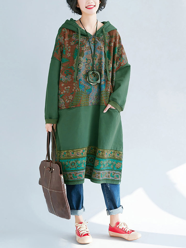 Damska sukienka z długim kapturem i kieszeniami w etnicznym stylu z kwiatowym wzorem