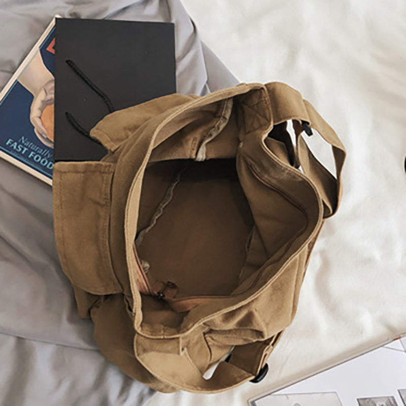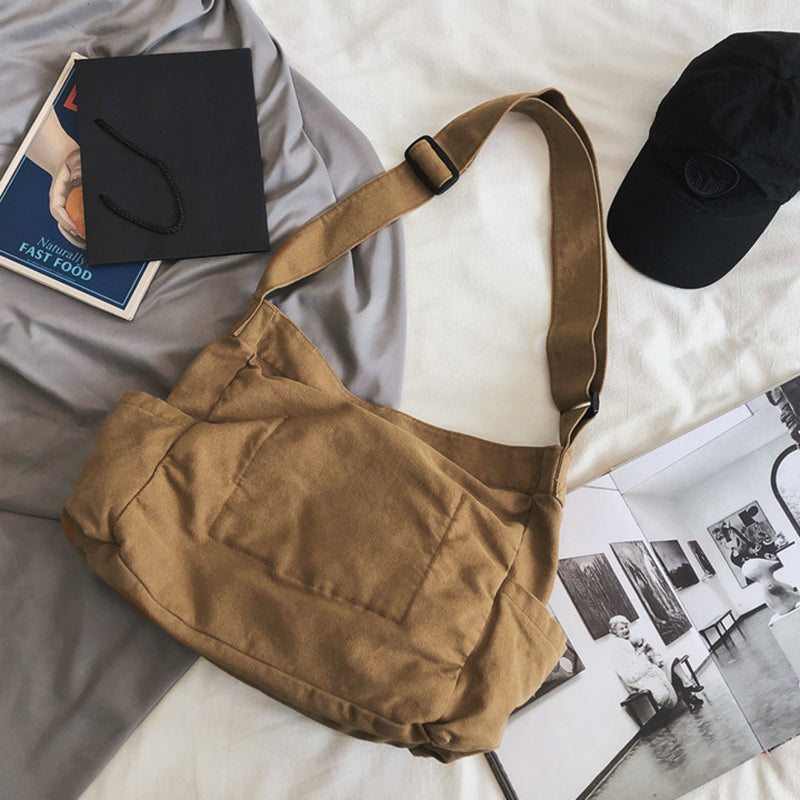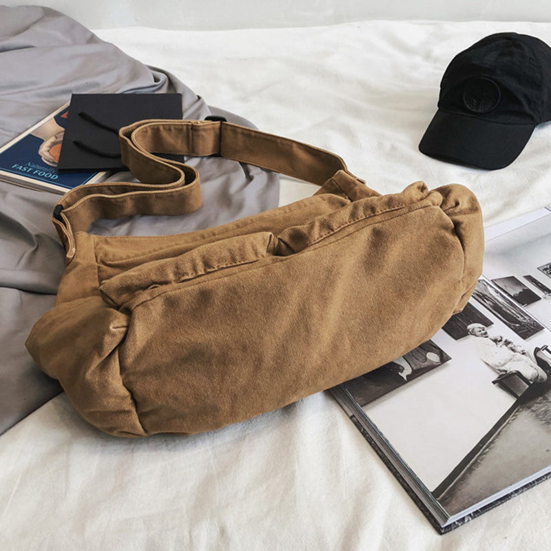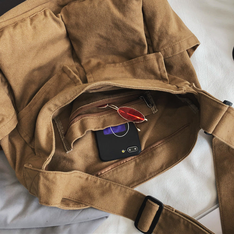 Ta pojemna, swobodna torba na ramię z płótna jest idealna na codzienne niezbędne rzeczy. Główna komora ma regulowany pasek i dwie kieszenie boczne. Wewnątrz znajdują się dwie wewnętrzne kieszenie wsuwane i kieszeń zapinana na suwak. Ta torba może być używana jako plecak lub torba crossbody.